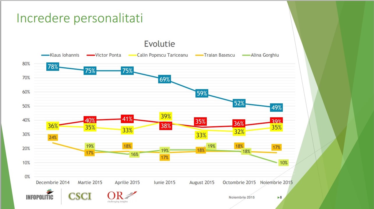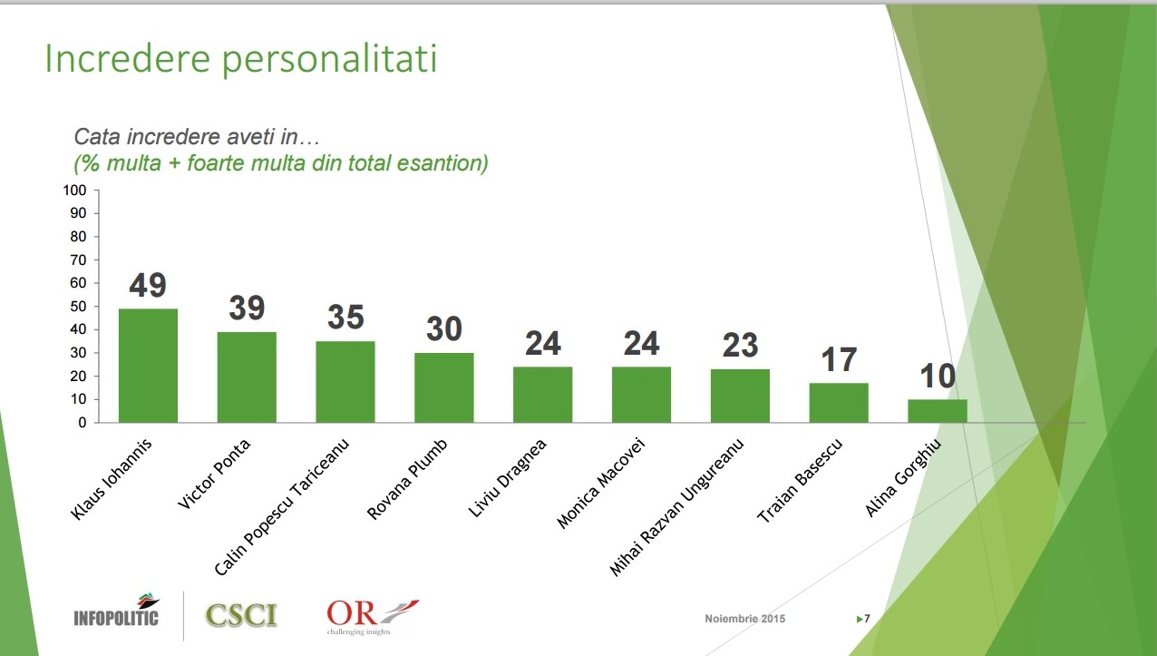 La nivelul încrederii în liderii politici, niciunul nu are peste 50%. Chiar daca este în scădere, Iohannis rămîne pe prima poziție în top, cu 49%, în timp ce încrederea în Victor Ponta crește de la 36% (în octombrie) la 39% în noiembrie. Liderii politici se poziționează ceva mai jos in clasament - Călin Popescu Tăriceanu - 35%, Liviu Dragnea - 24%, Traian Băsescu - 17% și Alina Gorghiu - 10%.