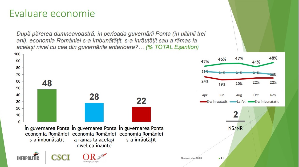 Conform sondajului, numărul românilor care consideră că în Guvernarea Ponta starea economiei s-a îmbunătățit a crescut cu 7 procente, de la 41% (octombrie) la 48% (noiembrie) - de peste două ori mai mare decât cei care sunt de părere că starea economiei s-a înrăutățit -22%.