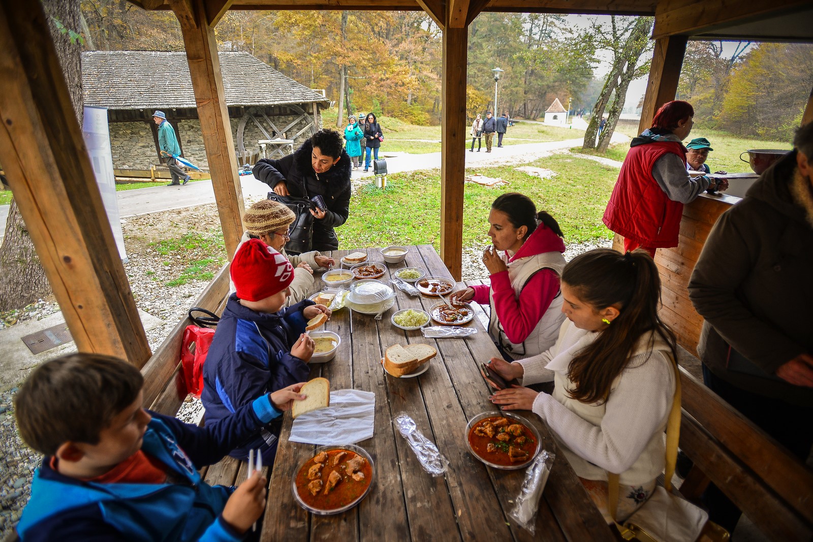 Sibienii care au trecut duminică prin muzeul din Dumbrava Sibiului au putut gusta ciorbă de cartofi cu tarhon cu afumătură, gulaș, dar și lichiu cu griș, o specialitate din zonă. Totodată, cei interesați au putut cumpăra la prețuri modice bocane de murături, gem de prune, dulceață de dovlecei și alte astfel de bunătăți.