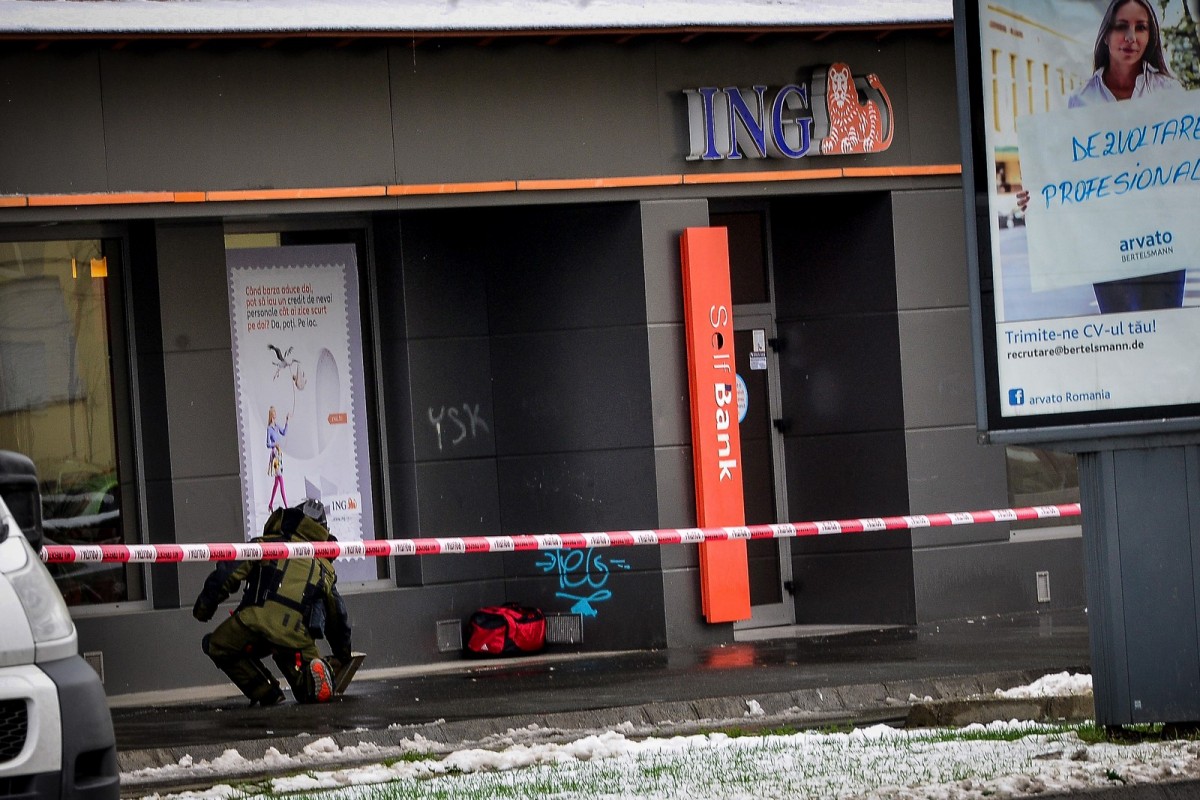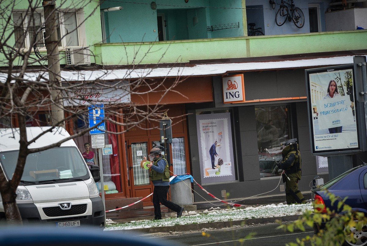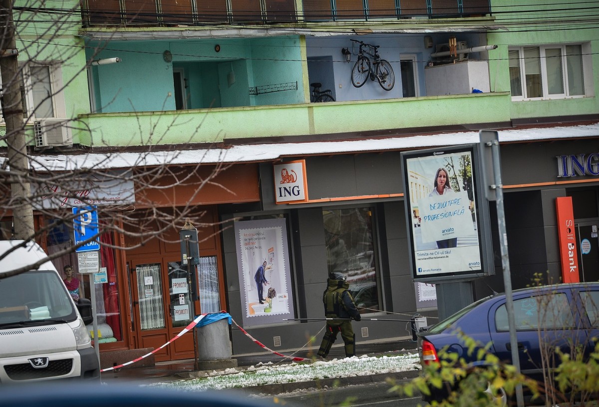 Traficul pe Mihai Viteazu a fost deviat, strada fiind închisă. Forțele ISU așteaptă intervenția pirotehniștilor. Geanta suspectă este roșie și a fost lăsată pe trotuarul din fața clădirii ING.