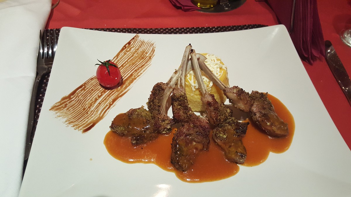 În cele ce au urmat, ”curcubeistica” experiență din prima încăpere a restaurantului a continuat în farfurii. Exploziile de culoare au avut un ritm crescendo, iar experiența vizuală a fost de fiecare dată urmată de o adevărată desfătare a papilelor. De la supa ușoară în care cu greu distingeai urmele de usturoi, combinată cu pâinea cu brânză care dădea consistență, până la mielul care a fost prăjit în bucăți pentru a-i mai stinge din roșeața sângerie și presărat cu ierburi de parcă un grec neaoș stătea ascuns în bucătărie, totul a fost absolut delicios.