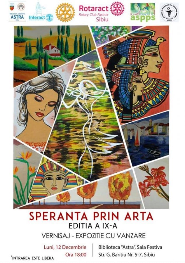 Club Rotaract şi Club Rotary Sibiu, în colaborare cu Asociația Spitalului de Psihiatrie „Dr.Gh.Preda“ şi Spitalul de Psihiatrie „Dr.Gh.Preda“ din Sibiu, organizează expoziţia de pictură, desen, ceramică şi articole decorative ”Speranță prin Artă”. Evenimentul, aflat la a IX-a ediției, va avea loc luni, 12 decembrie, începând cu ora 18, la Biblioteca Astra.
