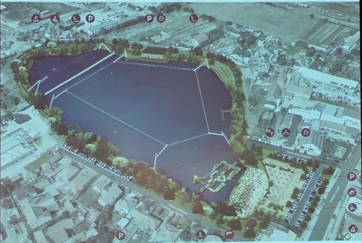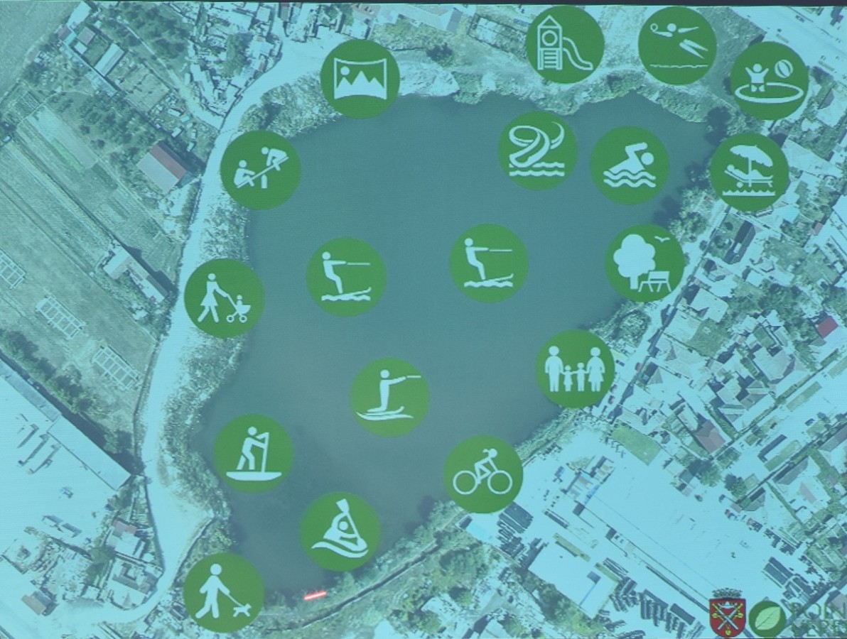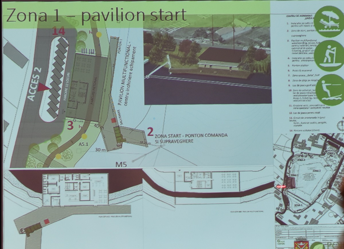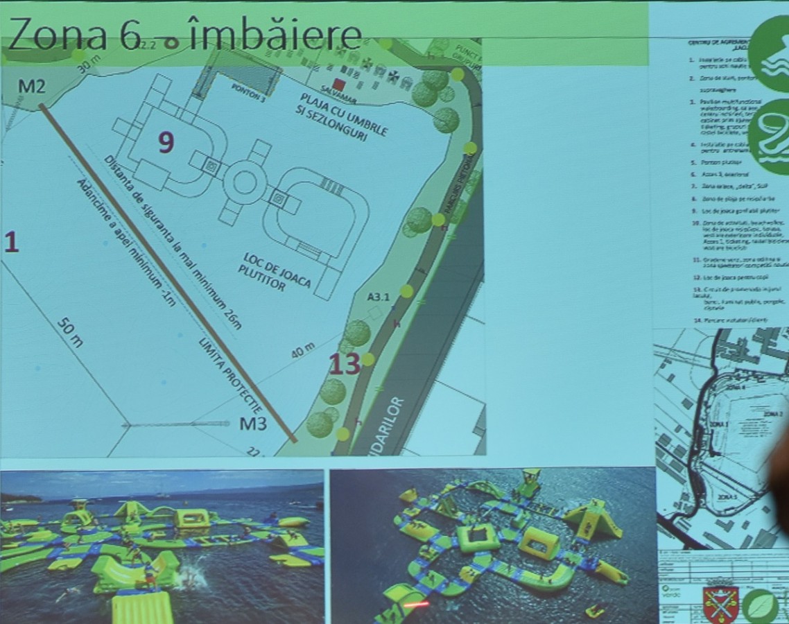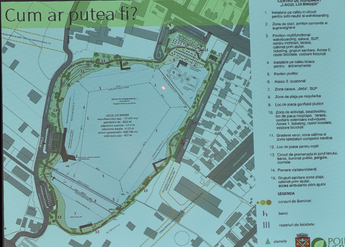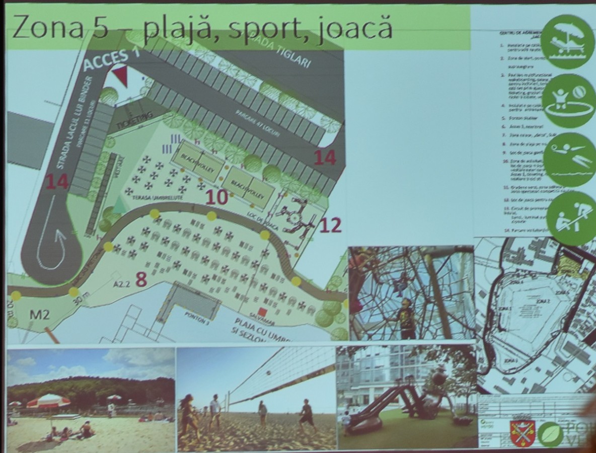 Prezentarea a fost generată de finalizarea studiului de fezabilitate pentru acest proiect, studiu contractat în prima parte a lunii august din acest an și realizat de Point Verde din Sibiu pentru suma de 110.000 de lei. Planurile prezentate de arhitectul Mihai Țucă, reprezentantul Point Verde, grupează activitățile viitorului centru de agrement în șapte: zona de acces principală cu un pavilion cu mai multe funcțiuni, zona unui ponton plutitor care va reprezenta locul de start pentru cei care vor practica schiul nautic și wakeboardingul, precum și o zonă dedicată celor care vor să se dea cu caiacul sau să practice SUP (stand up paddle – un fel de placă pe care se stă în picioare, poziție din care se și vâslește). Celelalte zone sunt cele de gradene verzi, cea de plajă, sport și joacă, cea de îmbăiere și, în fine, cea de promenadă, aceasta din urmă înconjurând tot lacul.