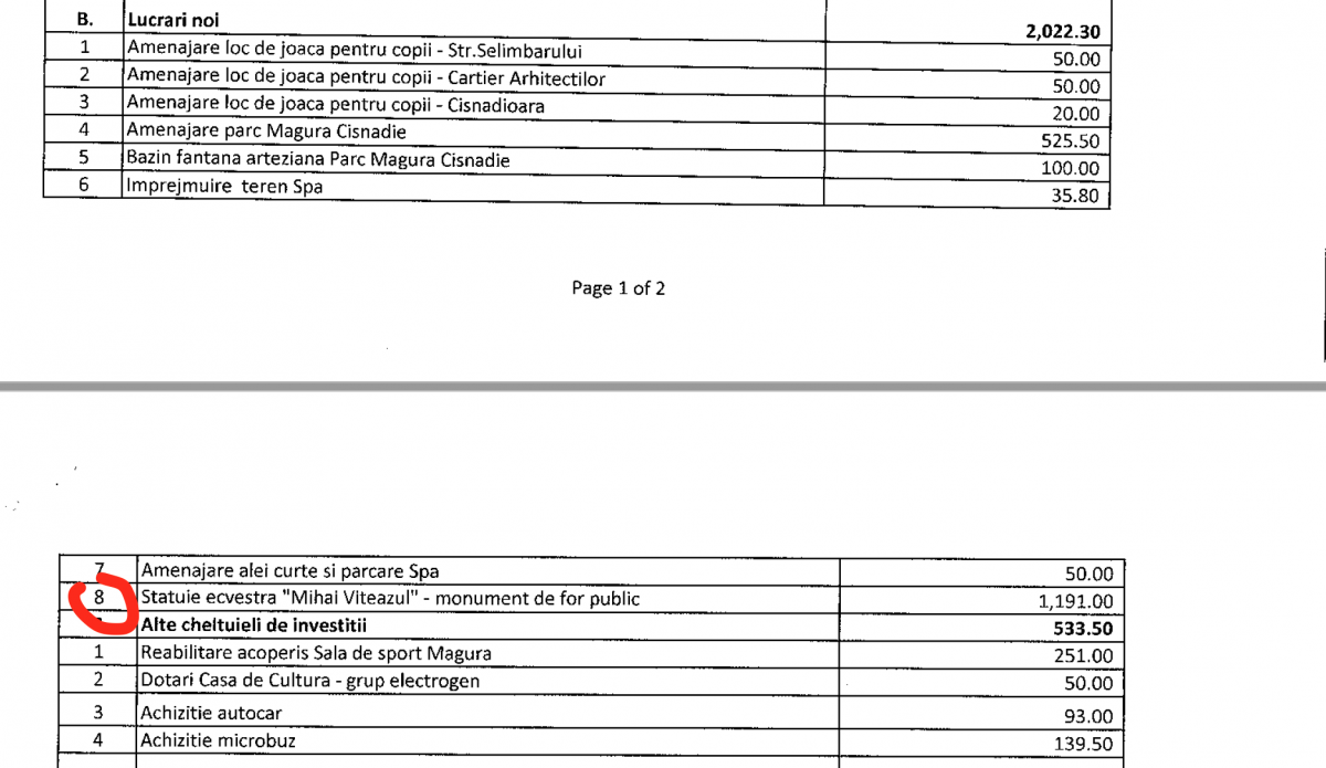 Asociația pentru Dezvoltarea Cartierului Arhitecților, înființată în toamna anului trecut, critică prezența în proiectul de buget al orașului Cisnădie pentru anul 2018 a unei posibile viitoare statui. "Cu stupefacție am constatat că, pe lângă deja renumitul, "necesarul" și costisitorul SPA anunțat încă de anul trecut, proiectul de buget prevede o investiție nouă, neașteptată (dar probabil la fel de necesară) - Statuia ecvestră "Mihai Viteazul", ce ar urma să fie amplasată în Piața Revoluției. Suma prevăzută în bugetul pentru 2018 pentru acest proiect este de 1.191.000 lei. Asta în condițiile în care, banii prevăzuți pentru investiții într-un cartier în care locuiesc aproximativ 8000 de suflete, Cartierul Arhitecților, cumulează 438.000 lei, bani care urmează să fie utilizați pentru amenajarea unui loc de joacă pentru copii și a unui drum de exploatare - fiind probabil vorba de pietruirea străzii Petre Antonescu", se arată în comunicatul celor de la ADCA.
