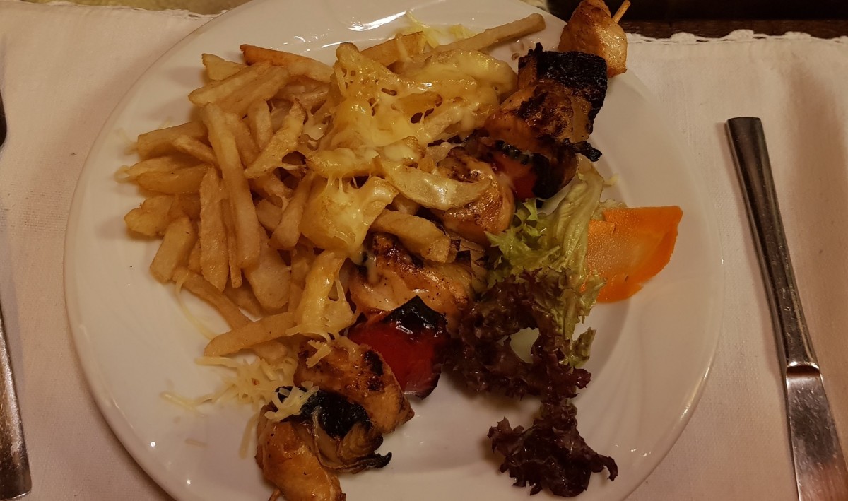La felul principal - ajuns la 50 de minute în fața noastră de la momentul lansării comenzii - am avut o porție de frigărui de pui cu cartofi prăjiți și una de vită picantă, cu aceiași cartofi, dar numai fierți, căci așa am cerut.