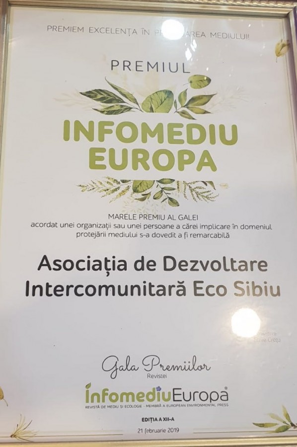 Asociația de dezvoltare intercomunitară (ADI) Eco Sibiu a primit marele premiu al Galei premiilor revistei Infomediu Europa, organizată în parteneriat cu Federația Asociațiilor de dezvoltare intercomunitară din România. Premiul a fost acordat pentru modul de implementare a sistemului integrat de management al deșeurilor în județul Sibiu.