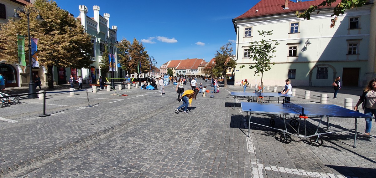 În contrast cu Piața Mare, inundată de acareturile Cibin Fest, Piața Mică liberă de mașini era o oază de liniște, spartă de chiotele celor care în partea dinspre sediul Primăriei se jucau cu ceea ce au adus cei de la Decathlon: arcuri, mese de ping-pong, ceva rachete de badminton, porți de minifotbal cu mingile aferente și așa mai departe.