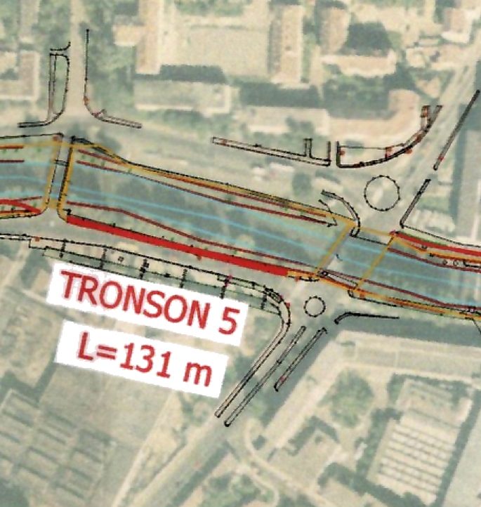 Tronson 5 în lungime de 131 m Se propune realizarea unei piste pentru biciclete în dublu sens (lățimea benzii de circulație pentru biciclete /sens fiind de 1,00 m), pistă de biciclete ce este poziționată pe amplasamentul actual al trotuarului stîng al străzii (pe direcția de mers dinspre strada Gladiolelor către strada Rusciorului).