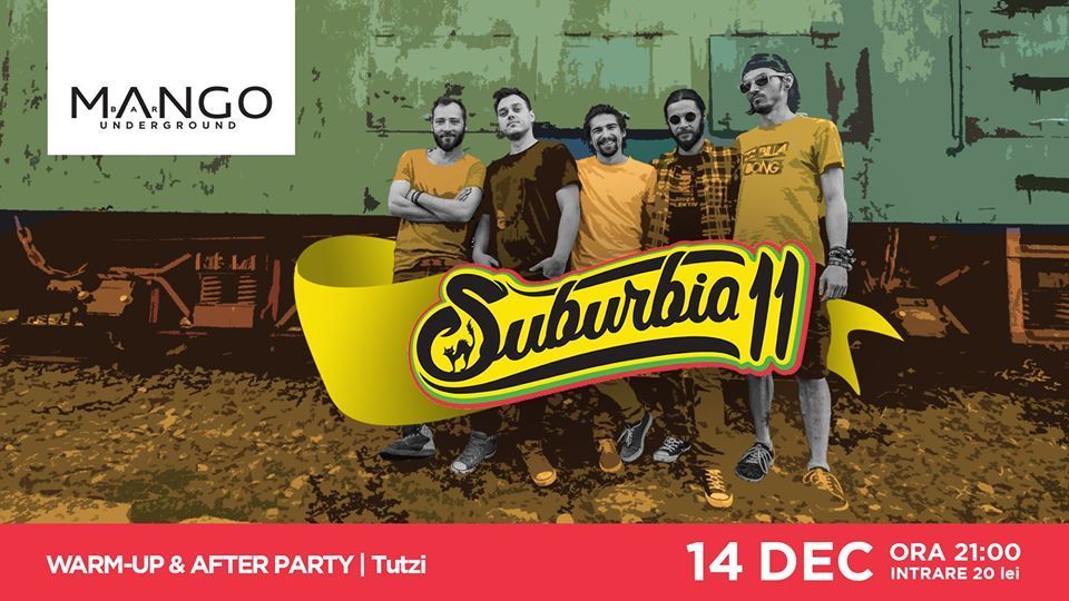 Ultimul concert de anul acesta din Sibiu la trupei Suburbia11 are loc la Mango, începând cu ora 21:00. După un an plin de concerte, trupa promite un concert de sărbătoare în care vor recapitula tot ceea ce s-a întâmplat în acest an. De asemenea, vor prezenta și lucrurile noi pe care le-au învățat pe parcurs. Sibienii vor fi întâmpinați de Tuți Tutz, care va încheia și seara. Prețul unui bilet este de 20 de lei, iar rezervări se pot face pe pagina de Facebook a barului sau prin numărul de telefon 0757881881.