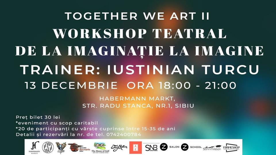 În Piața Habermann, începând cu ora 18:00, Iustinian Turcu va susține un atelier teatral cu titlul „De la imaginație la imagine”, în cadrul celei de-a doua ediție a „Together We Art”. Atelierul va avea la bază exerciții de imaginație, de muncă de echipă, de coordonare și expresivitate corporală. Iustinian Turcu este absolvent al studiilor Departamentului de Artă Teatrală, din cadrul Facultății de Litere și Arte - Universitatea Lucian Blaga din Sibiu, specializarea Artele Spectacolului- Actorie și absolvent al studiilor masterale din aceleași instituții. Din 2016 este actor la Teatrul Național Radu Stanca din Sibiu și deținătorul premiului UNITER pentru debut al anului 2017 pentru rolul Georg din spectacolul Martiri, regia Radu Nica. Prețul unui bilet este de 30 de lei și se pot înscrie 20 de participanți cu vârste cuprinse între 15 – 35 de ani.