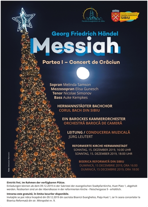 Corul Bach din Sibiu împreună cu o orchestră de cameră și patru soliști vocali, vor interpreta prima parte a oratoriului Messiah de George Friedrich Handel, la Biserica Reformată din strada Mitropoliei numărul 9. Din cauza faptului că spațiul biserici reformate nu este suficient de mare pentru a găzdui un public numeros, concertul va fi susținut de două ori. Primul va începe de la ora 16:00 și al doilea de la ora 18:00, pentru a facilita accesul cât mai multor persoane interesante să trăiască experiența acestei compoziții. Intrarea este gratuită, în limita locurilor disponibile. Mai multe detalii despre eveniment găsiți aici.