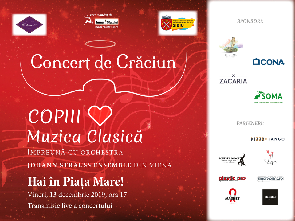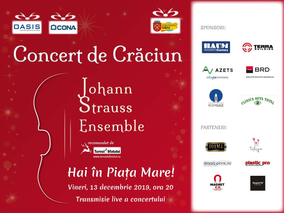 Asociația de Bun Gust organizează concertul de Crăciun „Johann Strauss Ensemble”, care a fi transmis în direct în Piața Mare, vineri, 13 decembrie 2019, de la ora 20:00, prin intermediul unui ecran de mari dimensiuni. Prin intermediul sistemului de sunet amplasat în Târgul de Crăciun, întreg centrul istoric al Sibiului va fi învăluit de muzica lui Strauss (fiul), Lehár sau Lumbye, dar și de colindele pe care instrumentiștii dirijați de carismaticul Russel McGregor le-au pregătit. Mai multe detalii despre eveniment găsiți aici.
