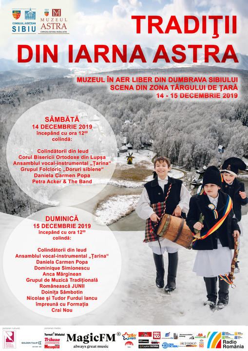 Muzeul ASTRA organizează în perioada 14-15 decembrie 2019 două programe speciale dedicate sărbătorilor de iarnă. Este vorba despre Târgul de Țară la Ignat și Tradiții din Iarna ASTRA, inițiative care vor avea loc în Muzeul în Aer Liber din Dumbrava Sibiului. Cele două programe formează împreună cel mai important weekend din agenda Muzeului ASTRA în perioada sărbătorilor de iarnă. Sâmbătă vor avea loc demonstrațiile culinare dedicate ignatului, care vor începe la ora 10:00. Colindătorii din Ieud, Corul Bisericii Ortodoxe din Lupșa, Ansamblul vocal instrumental „Țarina”, Grupul Folcloric „Doruri sibiene”, Daniela Carmen Pop și Petra Acker & The Band vor susține un concert de colinde de la ora 12:00. Duminică vor concerta Colindătorii din Ieud, Ansamblul vocal instrumental „Țarina”, Daniela Carmen Popa, Dominique Simionescu, Anca Mărginean, Grupul de Muzică Tradițională Românească Junii, Doinița Sâmbotin, Nicolae și Tudor Furdui Iancu împreună cu Formația „Crai Nou”. Mai multe detalii despre eveniment găsiți aici.