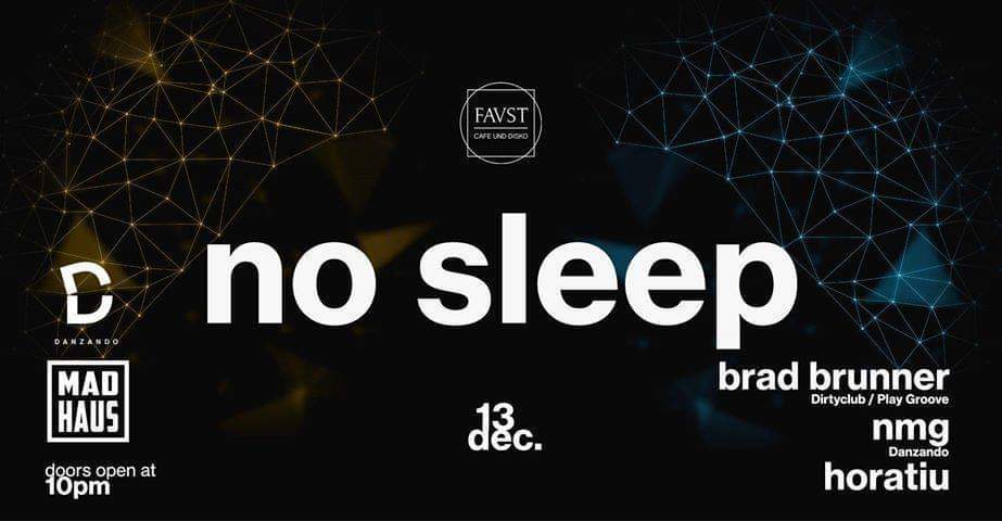 Faust Cafe und Disko organizează o seara de „No Sleep”, un eveniment care aduce muzica house și techno într-o petrece cu atmosferă de Ibiza. Evenimentele au fost fondate și sunt promovate de NMG, reprezentând o filozofie distinctă de non-conformism ce își doresc să devină o serie de petreceri care generează o energie unică și aduce oamenii împreună. Evenimentul îi aduce pe Brad Brunner, NMG și Horațiu, care vor întreține atmosfera. Intrarea este gratuită.