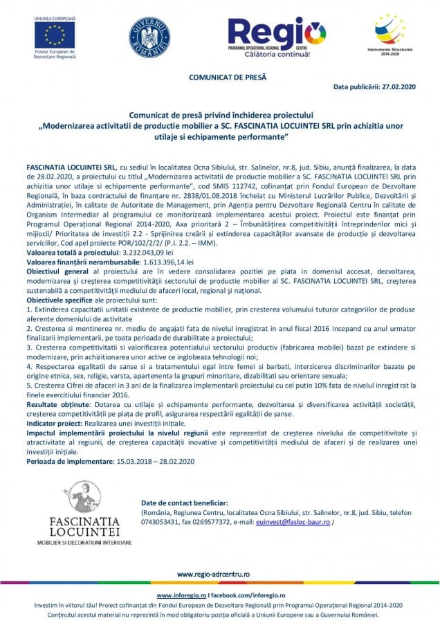 FASCINATIA LOCUINTEI SRL, cu sediul în localitatea Ocna Sibiului, str. Salinelor, nr.8, jud. Sibiu, anunță finalizarea, la data de 28.02.2020, a proiectului cu titlul „Modernizarea activitatii de productie mobilier a SC. FASCINATIA LOCUINTEI SRL prin achizitia unor utilaje si echipamente performante”, cod SMIS 112742, cofinanțat prin Fondul European de Dezvoltare Regională, în baza contractului de finanțare nr. 2838/01.08.2018 încheiat cu Ministerul Lucrărilor Publice, Dezvoltării și Administrației, în calitate de Autoritate de Management, prin Agenția pentru Dezvoltare Regională Centru în calitate de Organism Intermediar al programului ce monitorizează implementarea acestui proiect. Proiectul este finanțat prin Programul Operațional Regional 2014-2020, Axa prioritară 2 – Îmbunătățirea competitivității întreprinderilor mici și mijiocii/ Prioritatea de investiții 2.2 – Sprijinirea creării și extinderea capacităților avansate de producție și dezvoltarea serviciilor, Cod apel proiecte POR/102/2/2/ (P.I. 2.2. – IMM).