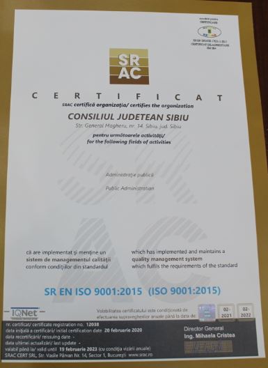 Prin implementarea și certificarea ISO 9001:2015 al Sistemului de Management al Calității, Consiliul Județean Sibiu dovedește încă o dată în mod obiectiv faptul că instituția acordă o mare importanță calității serviciilor oferite cetățenilor care apelează la serviciile instituției.