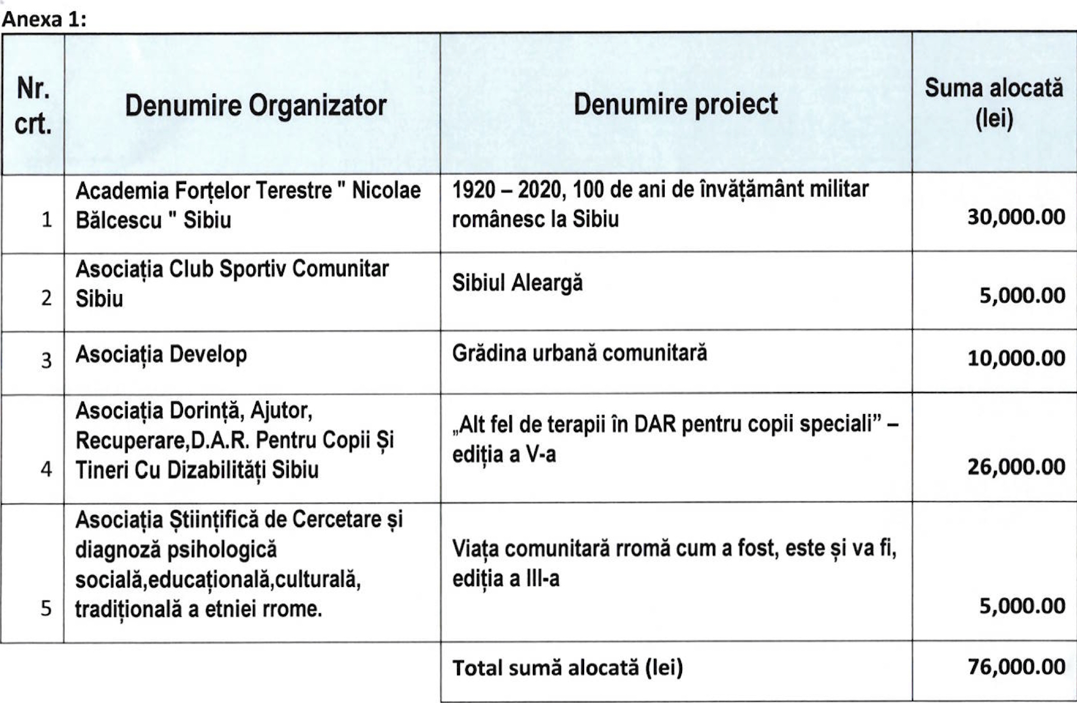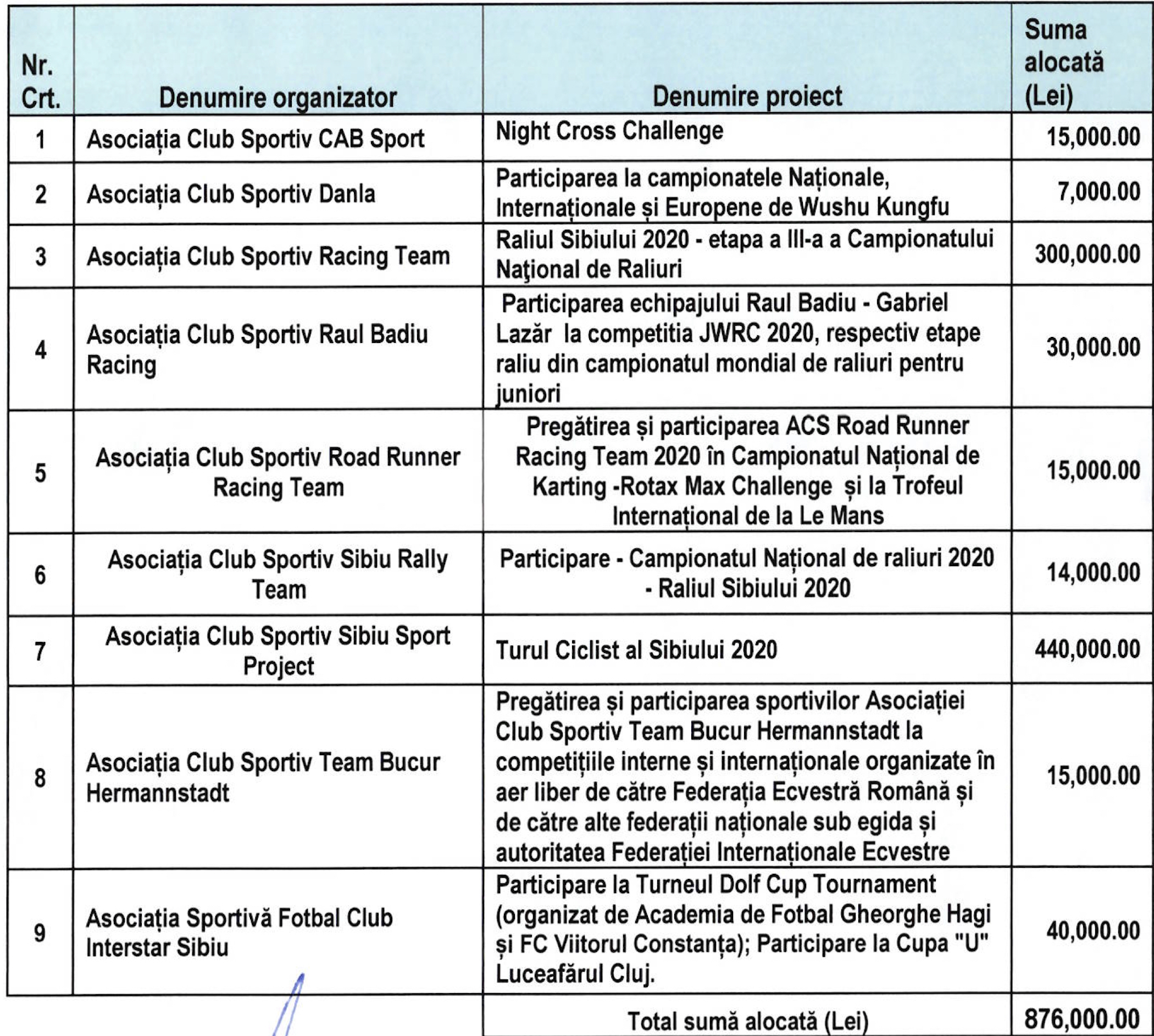 Pentru nouă proiecte de pe Agenda sportivă care au fost readaptate și depuse din nou în atenția comisiilor de evaluare este propusă alocarea unei cofinanțări de 876.000 de lei. Turului Ciclist al Sibiului îi sunt oferiți 440.000 de lei, iar Raliului Sibiului – 300.000 de lei.
