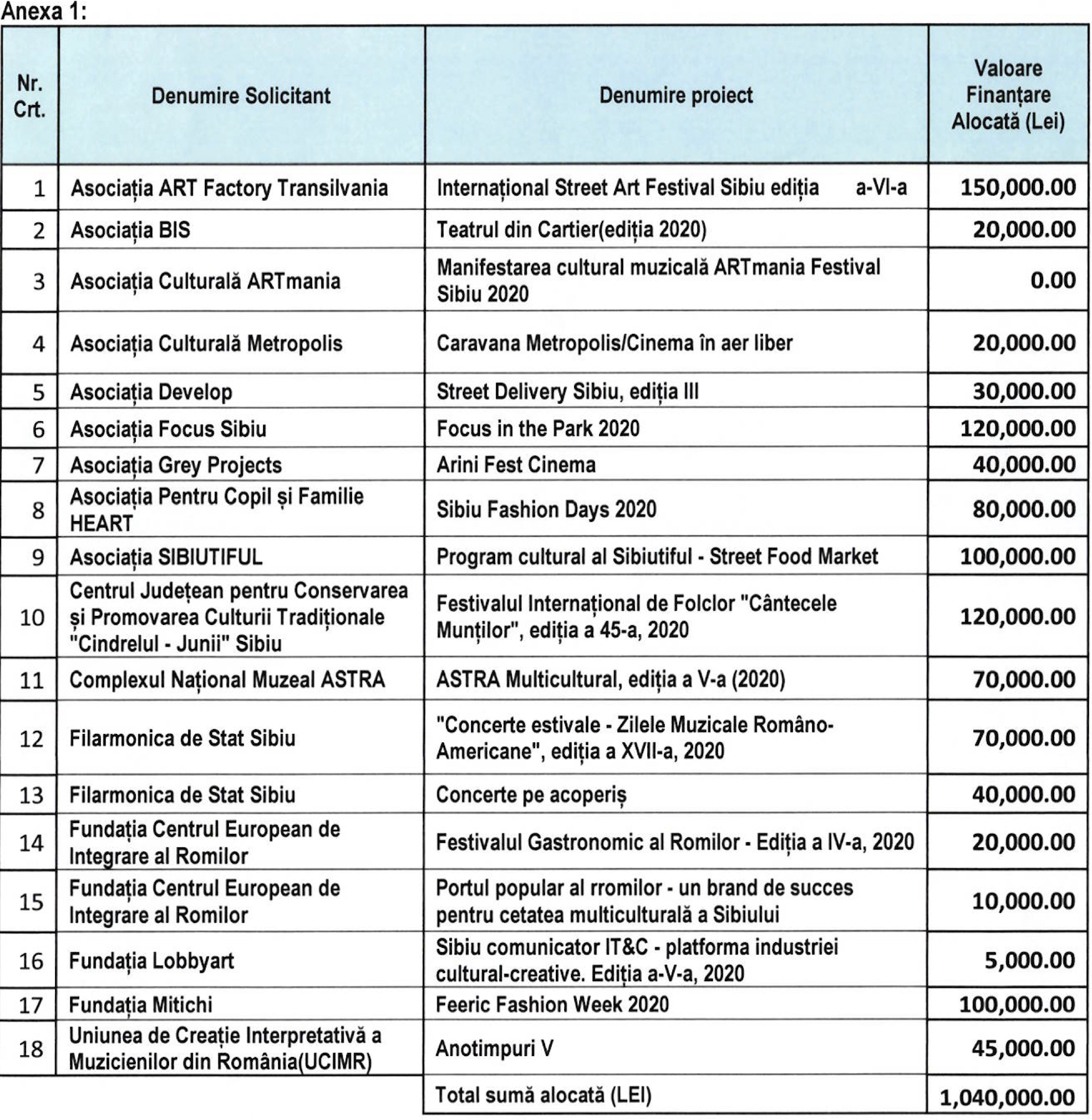 Cea mai mare cofinanțare este alocată celei de-a șasea ediții a Internațional Street Art Festival, serie de evenimente în cadrul căruia – printre altele – pe o serie de clădiri publice din Sibiu sunt realizate graffiti-uri de către artiști din țară și străinătate. 150.000 de lei este suma propusă a fi alocată acestui proiect.