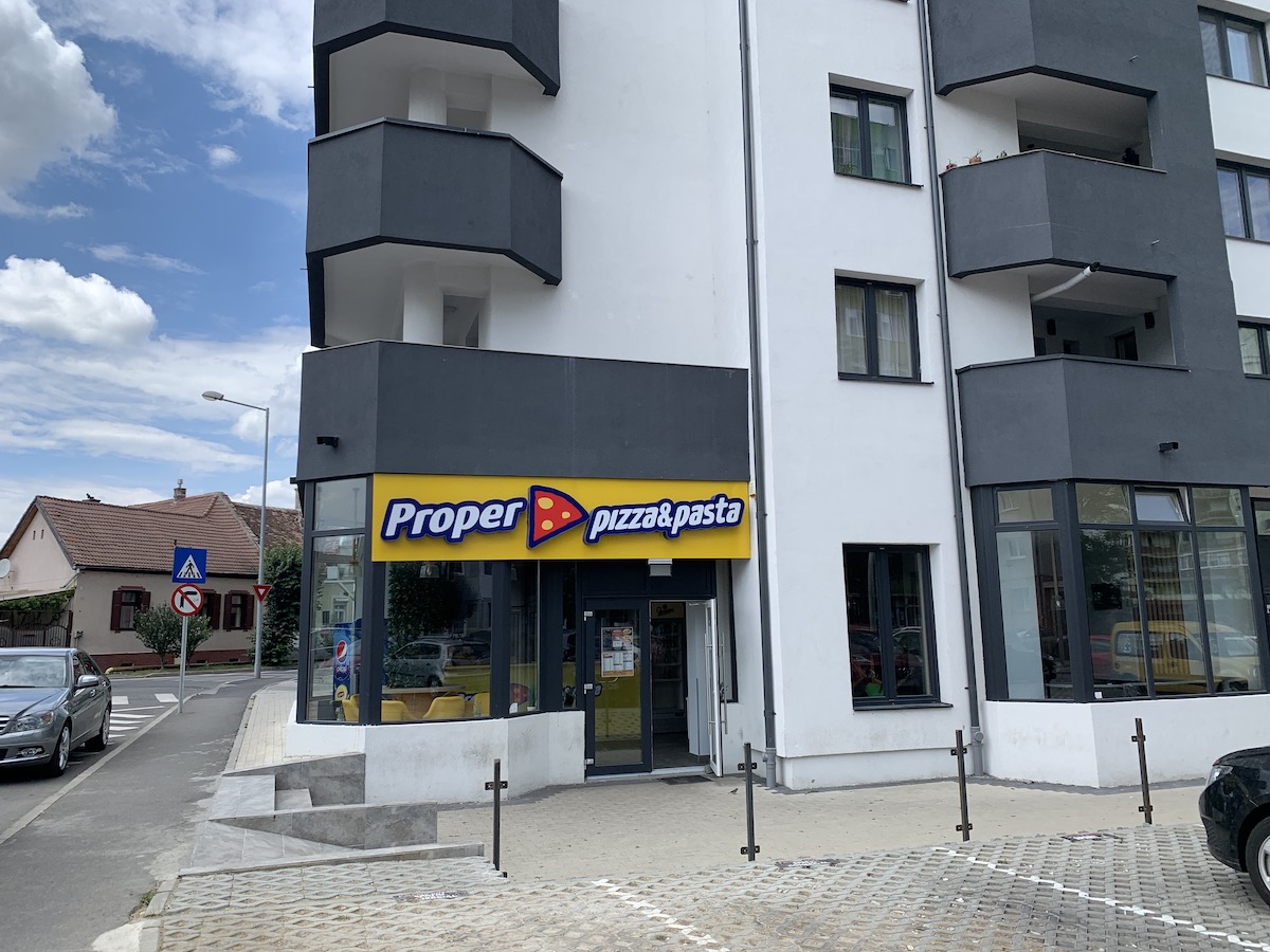 Și cum mă întorceam eu cu coada între picioare pe Calea Cisnădiei îmi sare în ochi o firmă de un galben pe care nu aveai cum să îl ratezi, chiar la parterul blocului lipit de Casa de Asigurări, Proper Pizza Sibiu. Chiar dacă nu aveau terasă unde să mănânci, lihnit fiind am zis că abuzez una din băncile din părculețul apropiat și o transform temporar în loc de luat masa, așa că am luat meniul la puricat, să vedem cu ce potolim căpcăunul. Primul lucru care mi-a plăcut, faptul că fac pizza mică. Rar sunt atât de înfometat încât să termin o pizza normală, tot timpul îmi e ciudă că rămâne și s-o mănânc rece nu-i chiar pe gustul meu. E primul loc în care am găsit pizza mică și la un preț decent, 14-15 lei.
