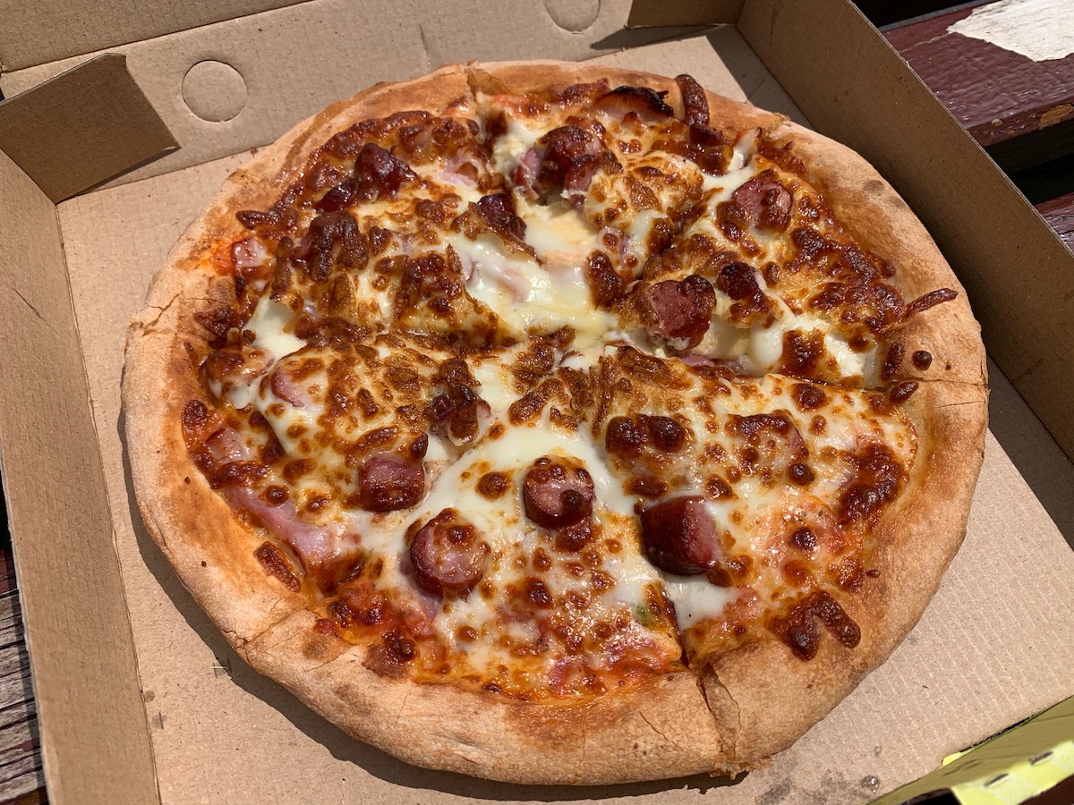 Sunt aproape convins că aluatul de pizza vine și el congelat și direct format, pentru că în momentul în care s-a răcit, s-a întărit într-un mod care îl făcea greu comestibil rece. Dar cald a fost o pizza decentă, n-aș zice chiar nu dacă s-ar ivi din nou ocazia unei pizza mici.