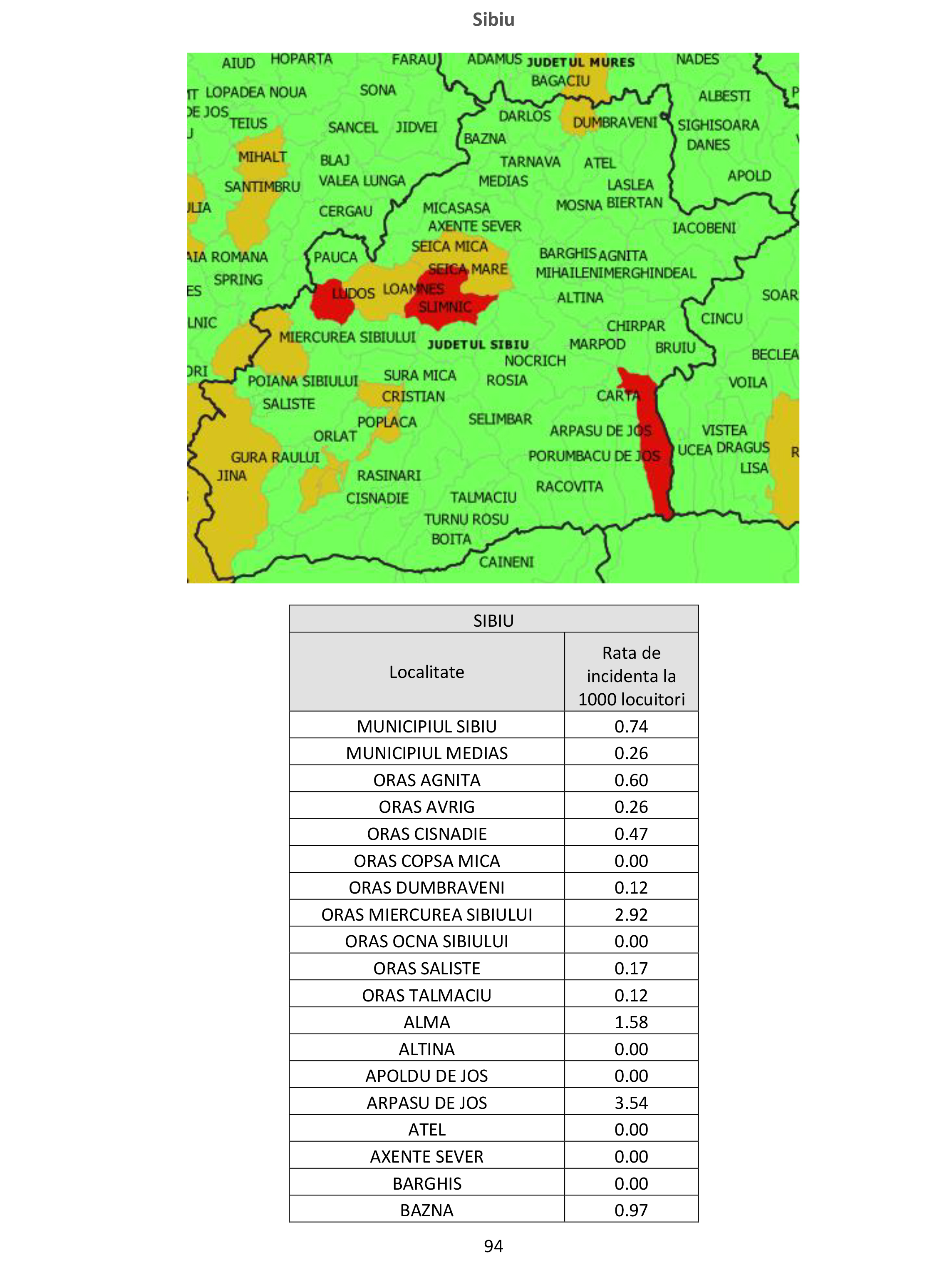 Potrivit datelor publicate de Ministerul Sănătății, în municipiul Sibiu rata de incidență la 1.000 locuitori este de 0.74, iar în Mediaș, de 0.26. Valori ridicate se întâlnesc în localitățile Arpașul de Jos, 3.54, în Ludoș, 4.35, în Slimnic, 3.25.