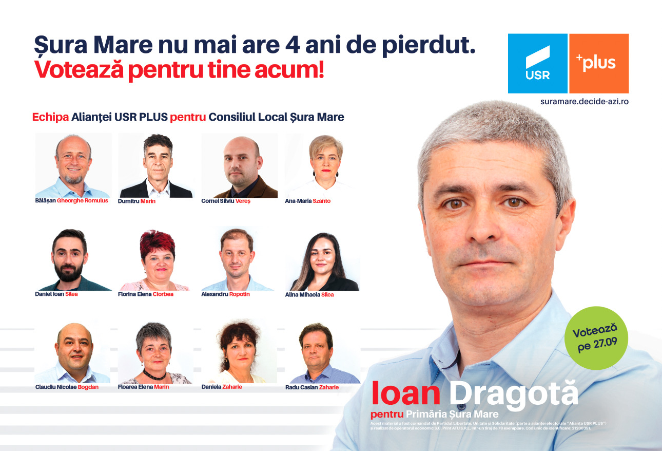 În 27 septembrie avem posibilitatea să votăm pentru viitorul nostru. Sper ca cetățenii din Hamba și Șura Mare să gândească strategic, să își maximizeze adevărata putere, iar dacă nici ei nu mai au patru ani de pierdut, să voteze candidatul Alianței USR PLUS, Ioan Dragotă și echipa de consilieri propusă de noi.