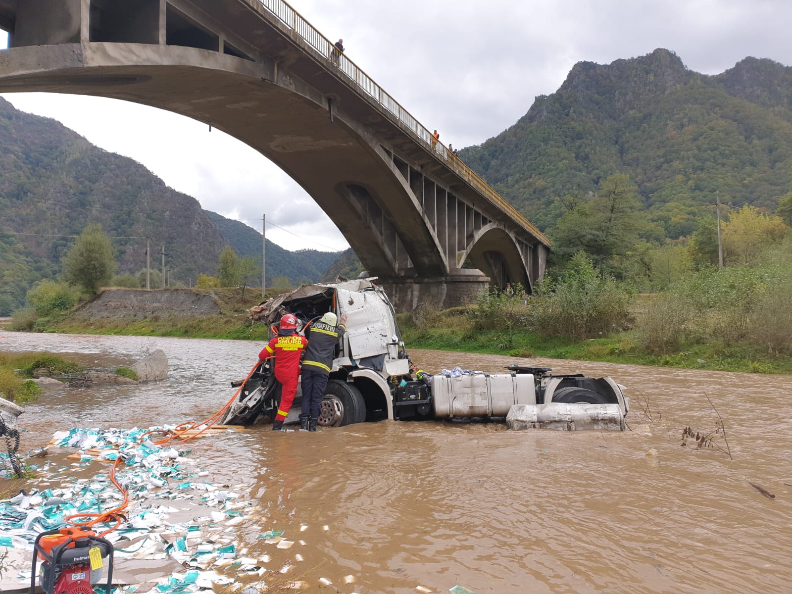 Potrivit polițiștilor, la km 207 - Brezoi, pe viaduct, un autocamion a părăsit partea carosabila trecând peste parapeții laterali, în albia râului Lotru. Traficul rutier este blocat în zona total din cauza încărcăturii din camion care a căzut pe carosabil (paleți). Capul tractor este înmatriculat în Brașov.