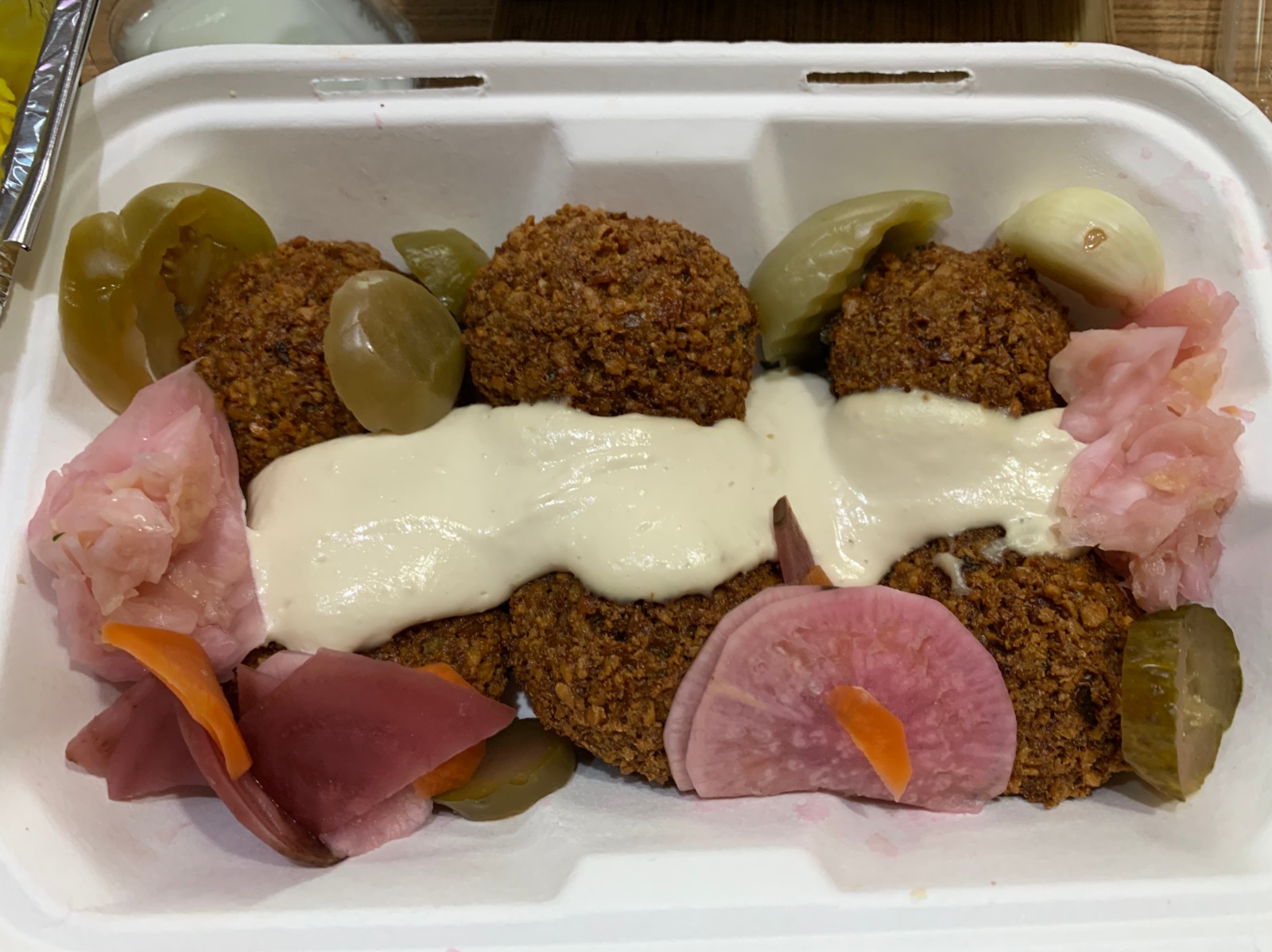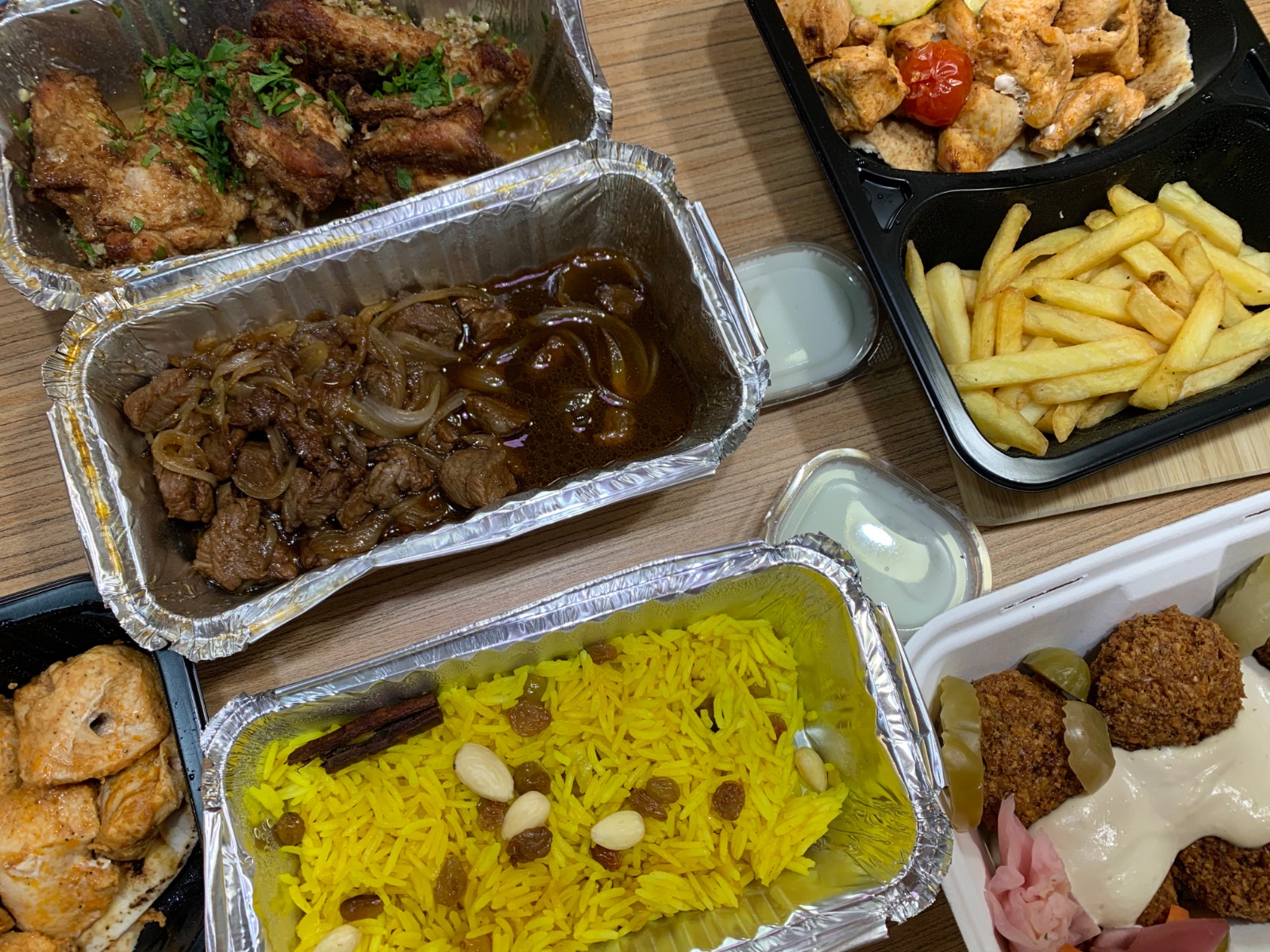 Mâncarea a ajuns în termeni rezonabili și suficient de caldă pentru a sări direct în farfurie. Am început cu sambusek-ul cu carne, un aperitiv, o plăcințică cu carne foarte consistentă și absolut delicioasă. A dispărut instant, urmat de regrete și acuze de zgârcenie că de ce nu am luat mai multe (de parcă n-am fost toți acolo când am făcut comanda). Foarte bun. După sambusek am atacat falafelul. Crocant la exterior, înfășurat cu un hummus foarte gustos și însoțit de o selecție de murături foarte potrivite ca și gust complementar, ușurel amare pentru gustul meu. Orezul a prins top 3 al preparatelor preferate, fiind singurele care s-au epuizat. Frigăruile de pui au fost bune, bine gătite, dar fără să aibă ceva deosebit, cei mici au apreciat mai degrabă cartofii prăjiți însoțitori, care au mers de minune cu sosurile de usturoi. Nici aripioarele de pui n-au strălucit, s-au mâncat, dar nu cu entuziasmului anterior.