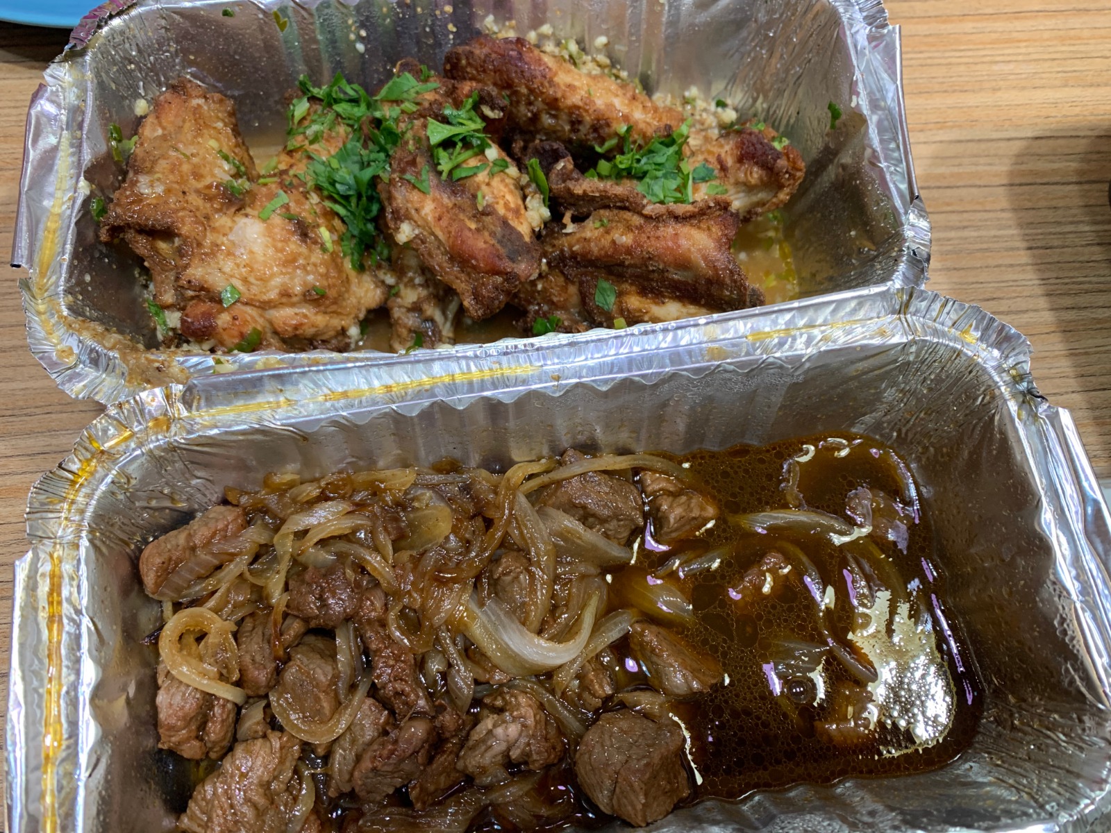 Am sondat ce-i nou, n-am găsit nimic convenabil care să livreze în afara Sibiului la prețuri cât de cât decente, până când mi-am adus aminte că nu-s trei zile de când am trecut pe lângă restaurantul Huma de pe Morilor, poate-o fi având site. Dintre toate site-urile pe care le-am deschis sâmbătă în căutarea prânzului, de departe, câștigătorul zilei. Program decent, deschis sâmbăta – ceea ce am văzut că e o raritate – livrare în toate localitățile din preajmă, de 4 ori mai ieftină decât taxiul pe acceași rută, și produse cât să n-ai ce să le bagi de vină. Specificul libanez al restaurantului ne-a dat un pic de furcă, pentru că n-am auzit de 95% din preparatele din meniu, dar cu răbdare ne-am ales cu toții mâncarea, trebuie să recunosc, cam la ghici. Am încercat să luăm din toate câte un pic, am luat două sambusek cu carne, 2 sish tawuk – frigărui de pui la jar – lipie cu susan, aripioare cu sos de lămâie și coriandru, orez galben cu sofran, stafide și migdale, o porție de falafel si un Ras asfour de vită, plus ceva sosuri cu usturoi.