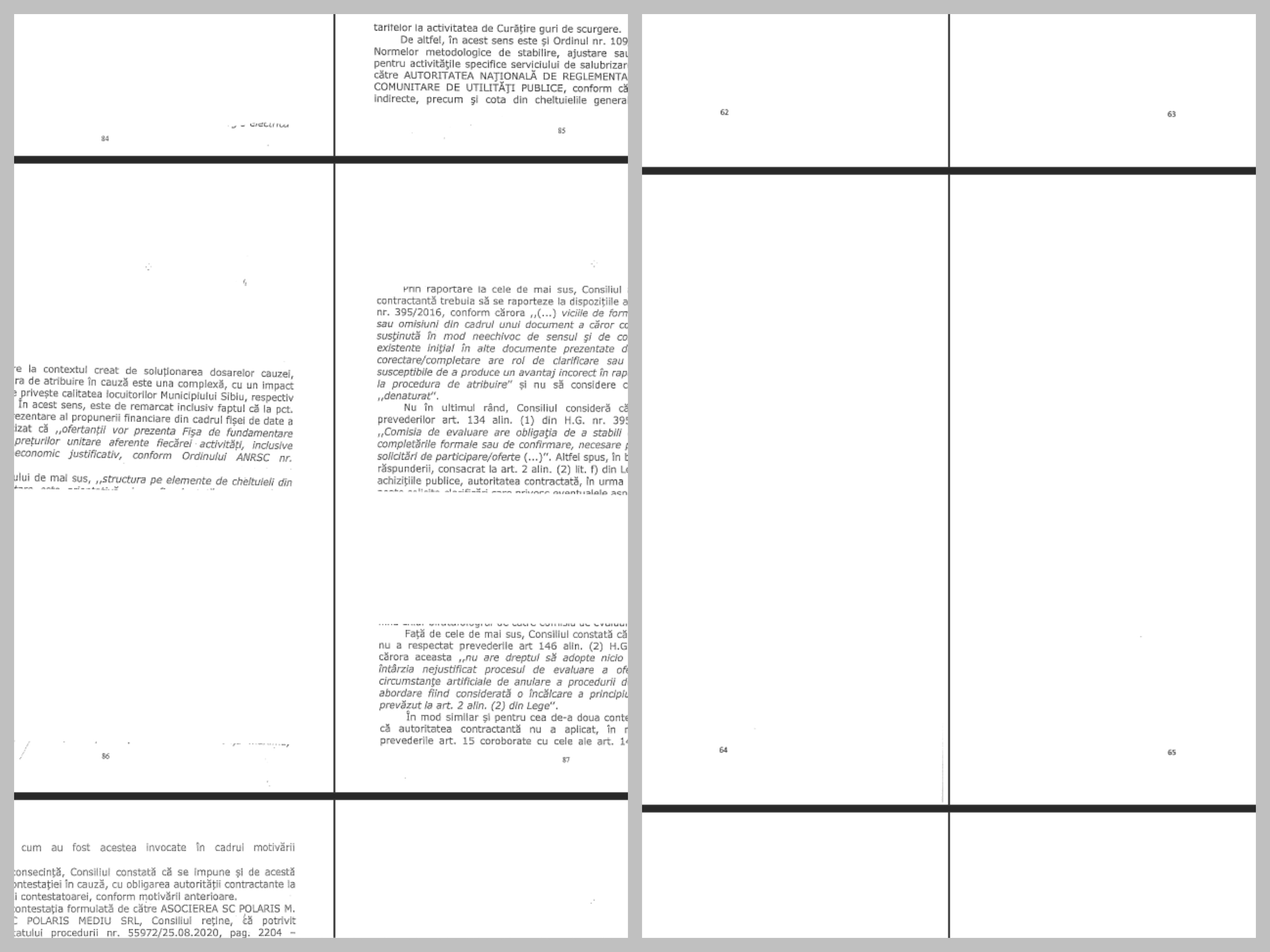 După ce au analizat contestațiile celor trei și opinia funcționarilor Primăriei Sibiu, judecătorii sibieni au ajuns la o concluzie: operatorii economici au dreptate, Primăria Sibiu, nu. ”Anulează raportul procedurii nr. 59442/24.08.2020, în partea privitoare la ofertele aparținând SC Soma SRL, Asocierii Salubritate SA - Terra Building SRL și Asocierea SC Polaris M. Holding SRL - SC Polaris Mediu SRL și toate actele subsecvente, inclusiv comunicarea rezultatului procedurii nr. 59972/25.08.2020 și obligă autoritatea contractantă la reluarea procedurii de atribuire în cauză, cu reevaluarea ofertelor de mai sus, în termen de 15 zile conform celor precizate în motivare și respectarea întocmai a legislației din domeniul achizițiilor publice”, se arată în decizia CNSC dată pe 6 octombrie 2020.