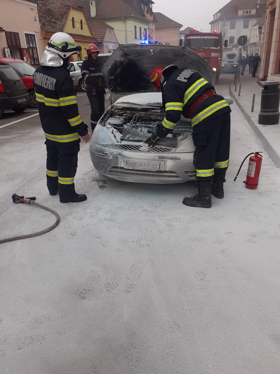 La fața locului au intervenit pompierii militari din cadrul Secției Mediaș, cu o autospecială de stingere cu apă și spumă și un echipaj SMURD. Incendiul izbucnit la bordul autoturismului în urma unui scurtcircuit electric, cu degajare de fum dens. Incendiul a fost lichidat prompt fără probleme.