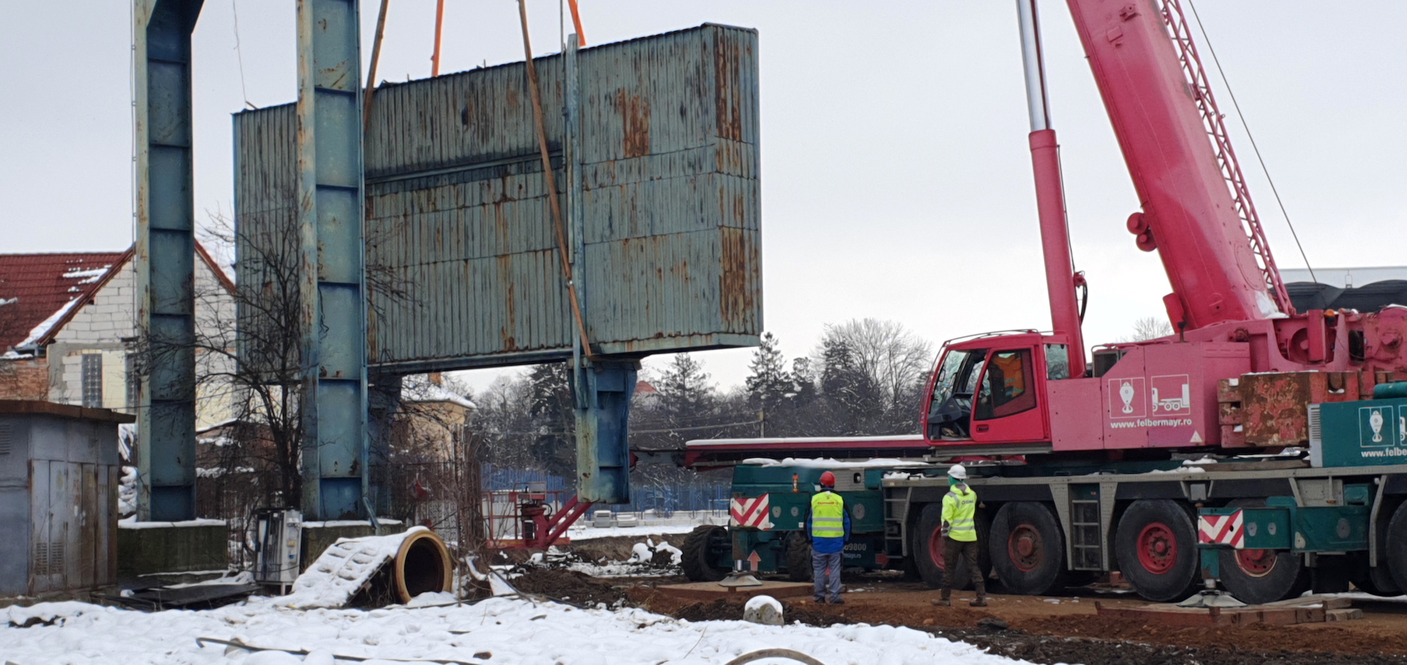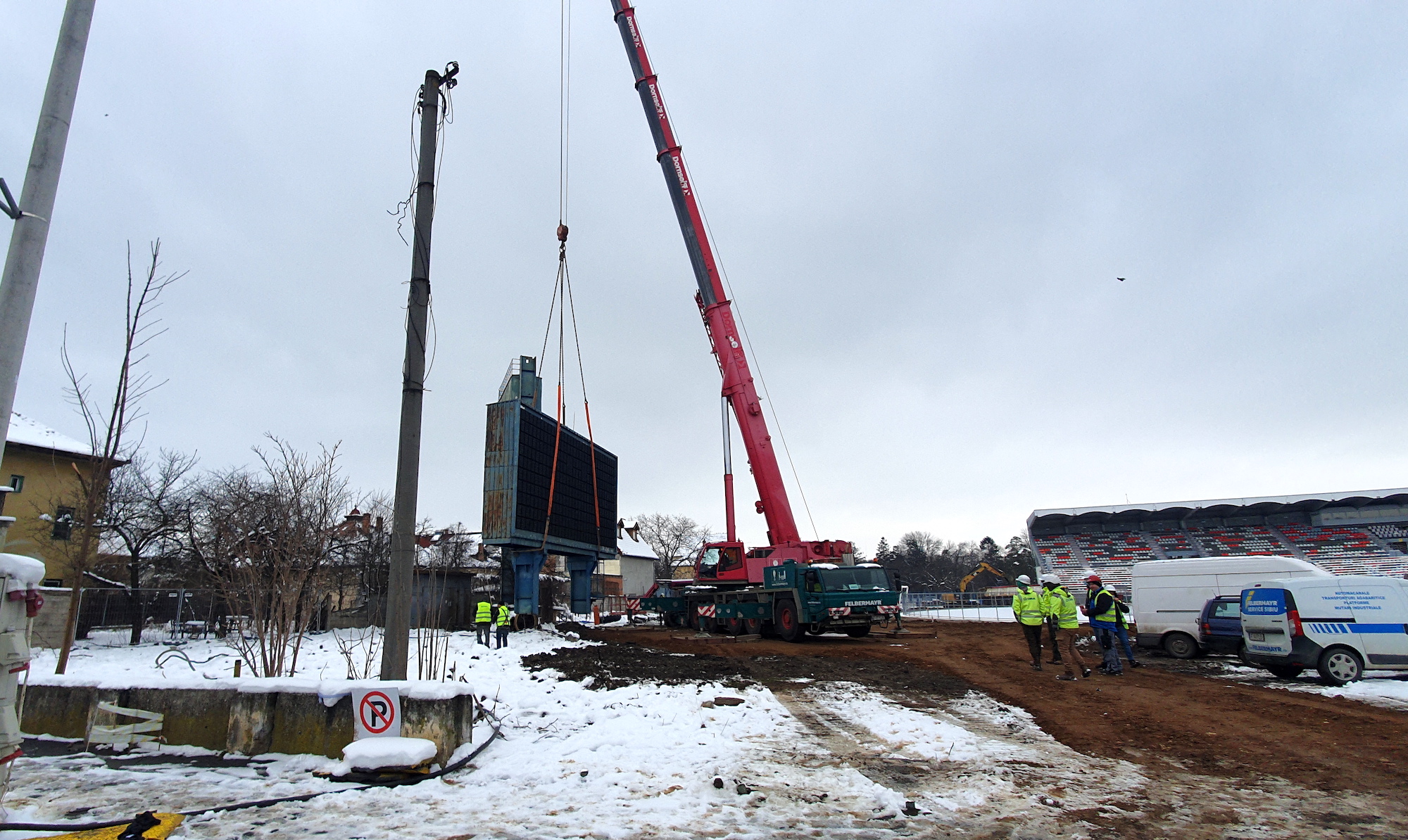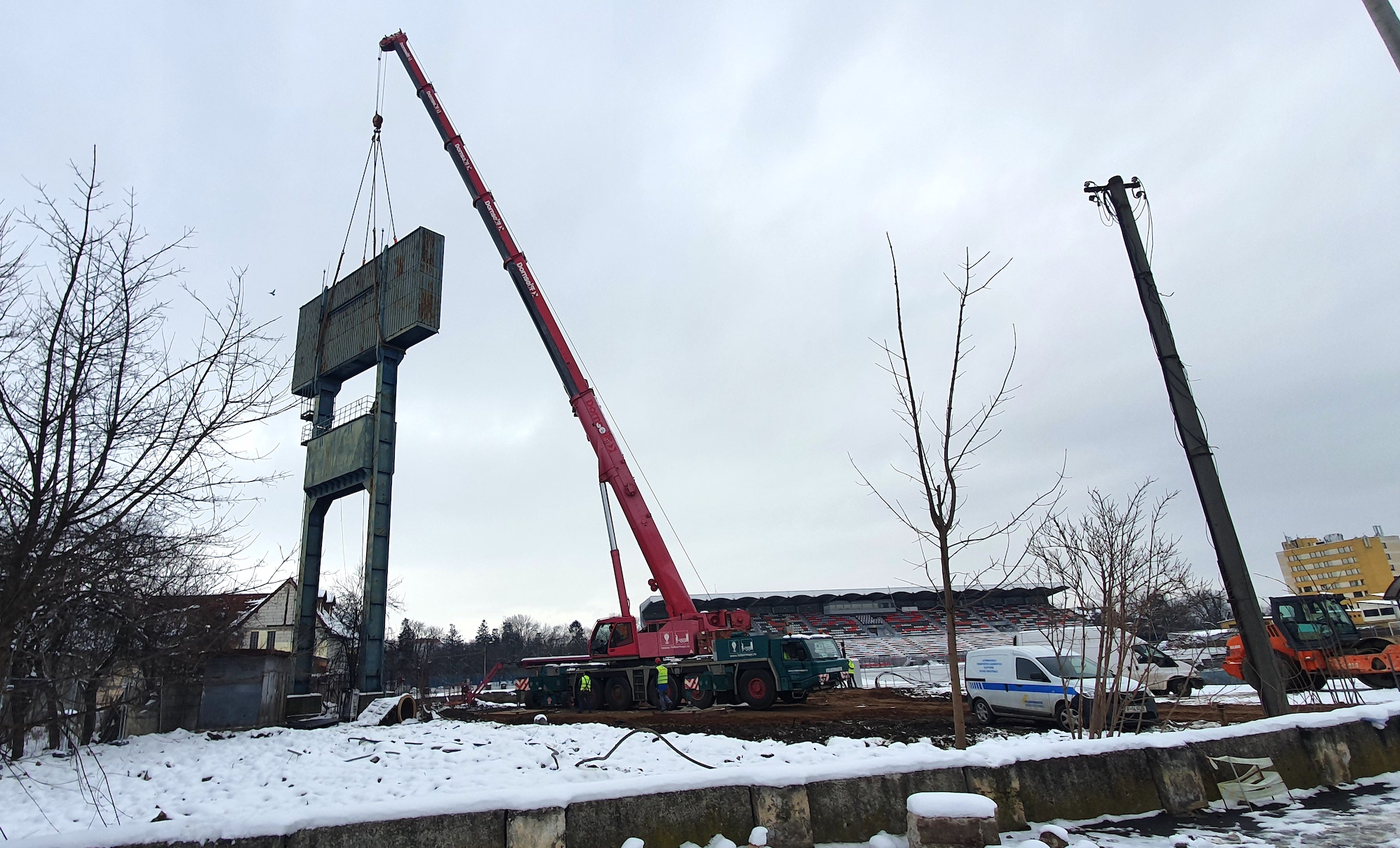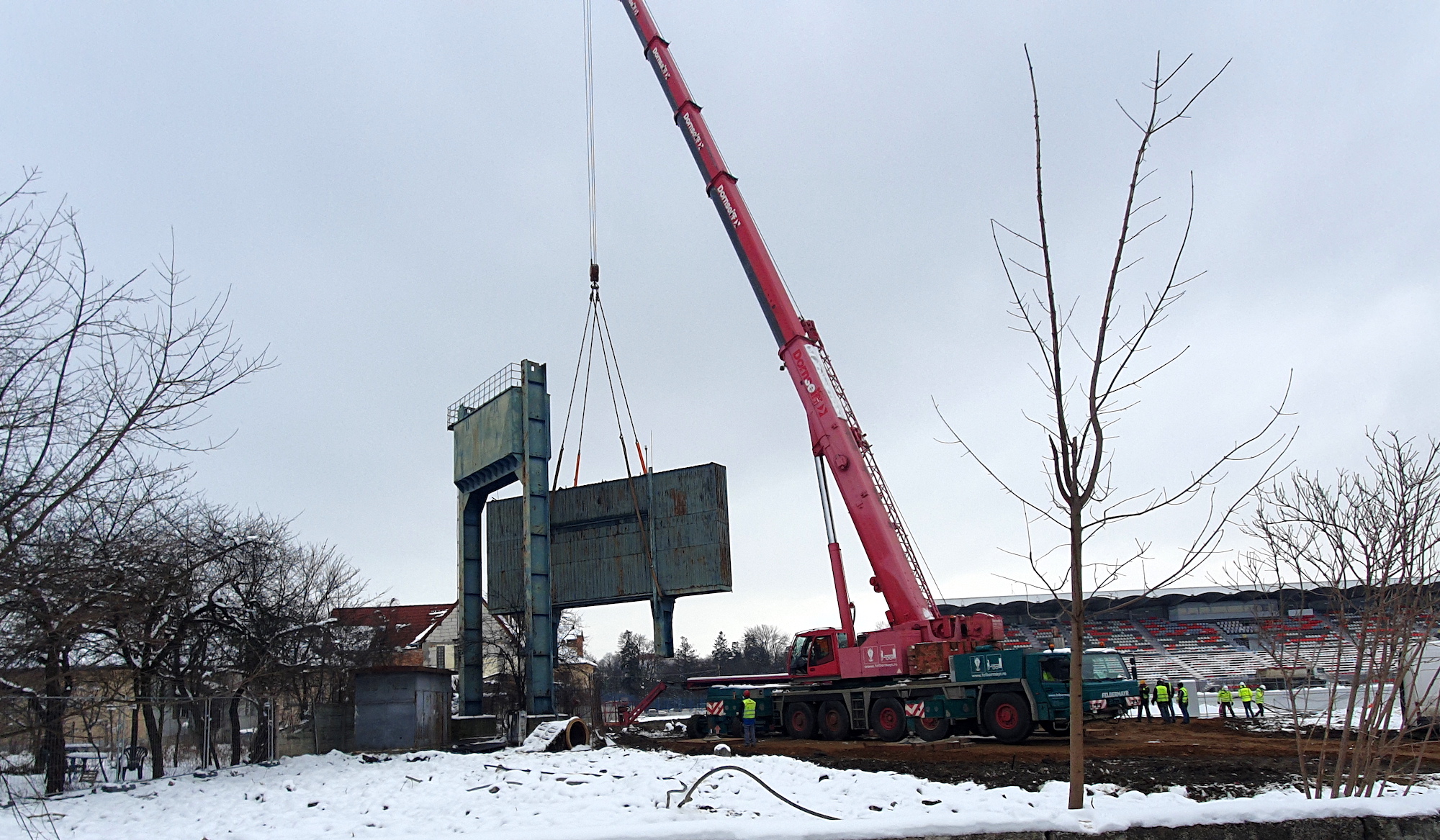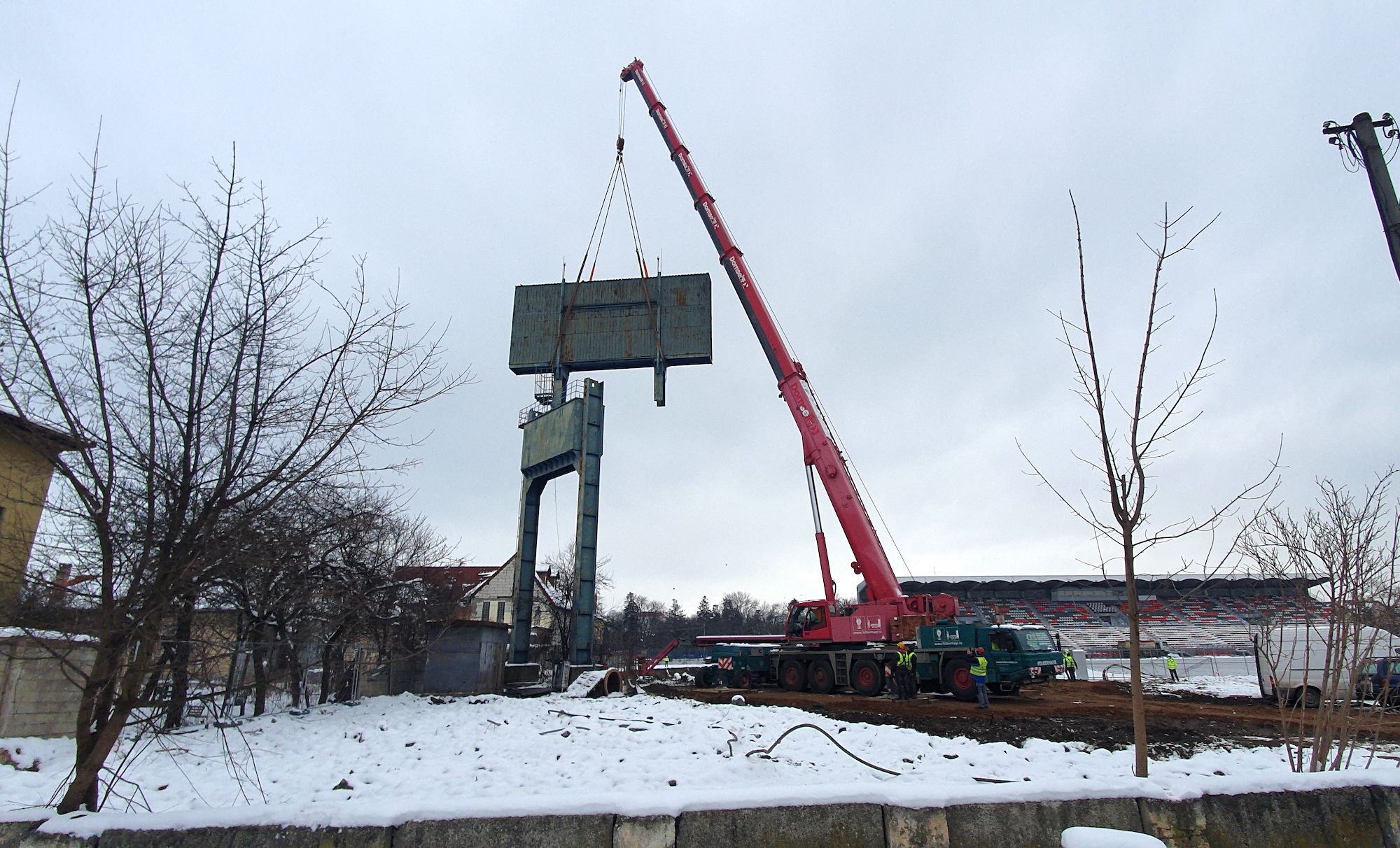 O greutate de 12 tone indicau senzorii macaralei care, miercuri după-amiaza, a coborât la sol partea superioară a vechii tabele electronice a stadionului din Sibiu. Respectiva parte a fost tăiată, urmând ca de același tratament să aibă parte și cele două picioare de susținere. ”Vor ajunge la fier vechi”, au explicat reprezentanții Con-A, compania sibiană de construcții care derulează lucrările de modernizare a stadionului.