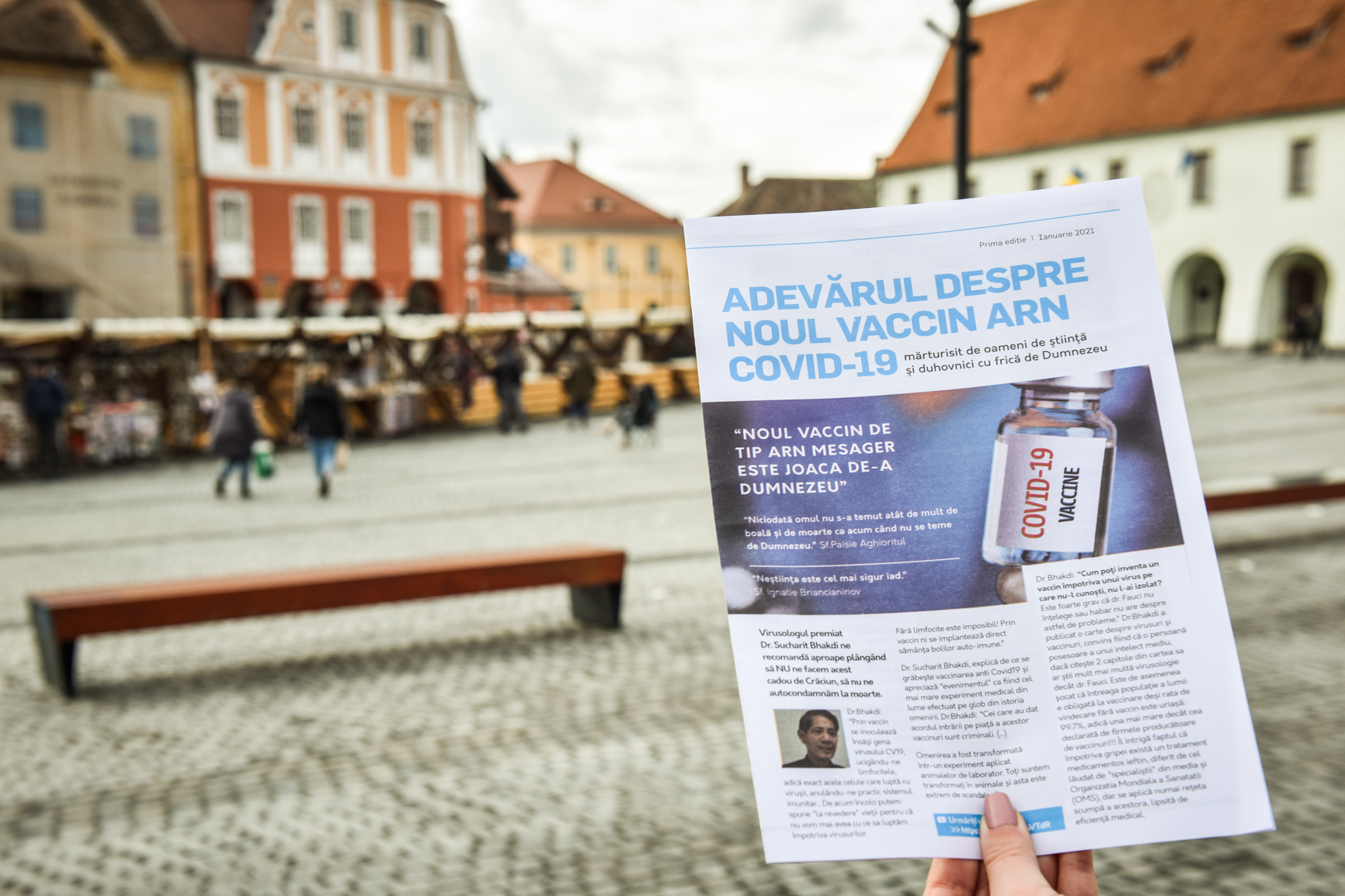 „Măștile sunt o crimă împotriva umanității și un abuz asupra copiilor”, „Vaccinul Covid 19 este un modificator genetic”, „Covid 19 este un program de exterminare în masă pentru populația lumii”, „Șantaj de stat: nu vrei vaccin, nu ai drepturi!”, „Dacă mama va lăsa copilul să fie vaccinat, este ca și cum l-ar da la moarte”, sau „Întreaga poveste a coronavirusului nu este altceva decât planul forțelor demonice, care constituie așa-numita globalizare și care are ca drept obiectiv să conducă societatea umană spre primirea perceții Antihristrului, adică cipul cu numărul 666, care va fi implantat în corpurile noaste sub pretextul vaccinului împotriva coronavirusului” sunt doar câteva fragmente din broșura „Adevărul despre noul vaccin ARN Covid-19” pe care o împărțea bărbatul.
