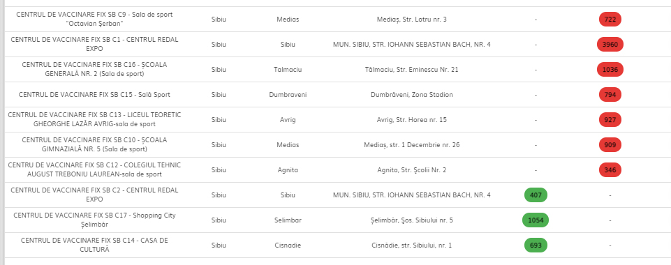 La ora redactării acestui material, cele mai multe locuri sunt disponibile la mall-ul din Șelimbăr - 1.054, urmat de centrul de la Casa de Cultură din Cisnădie - 693 și centrul C2 de la Redal Expo din municipiul Sibiu - 407. Pe platforma de vaccinare, în toate cele trei centre, locurile sunt disponibile începând cu dumincă, 18 aprilie.