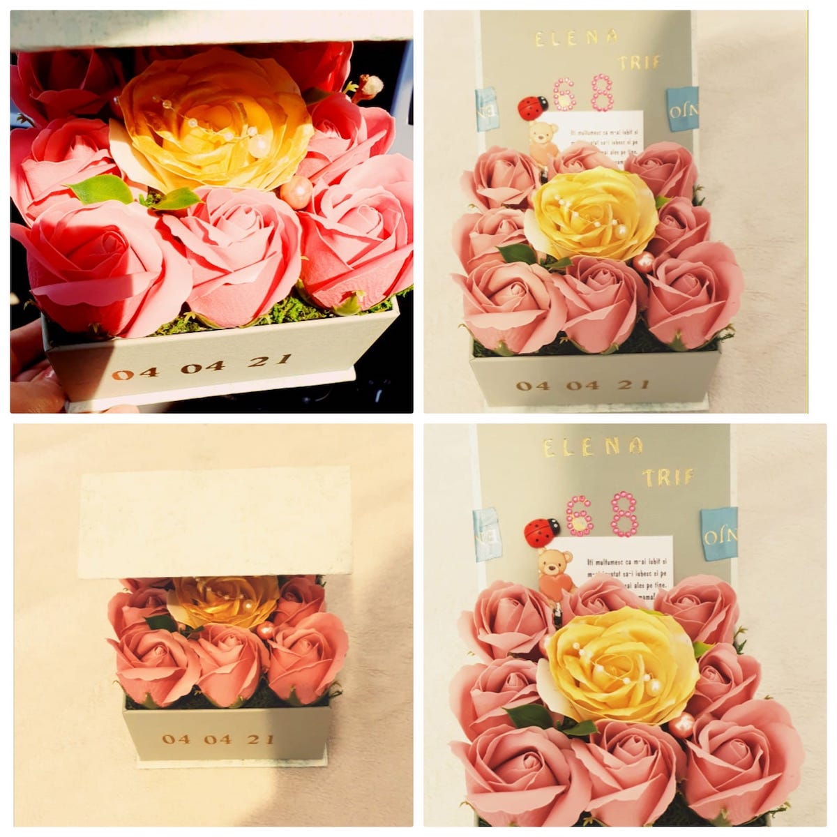 „Văzând că am un feedback foarte bun din partea clienților, am continuat să investesc. Pot să creez diferite modele și să le personalizez în funcție de bugetul clientului. Cred că afacerea mea a fost primită foarte bine, pentru că mulți sibieni au apelat la serviciile noastre. Investiția a fost una mică din punct de vedere material, am început cu pași mici. Dar a contat mai mult valoarea zâmbetelor oferite. Am investit aproximativ 3.000 de lei până în prezent”, spune sibianca. Materialele pe care le folosește sunt flori de săpun, dulciuri, flori artificiale și lemn.