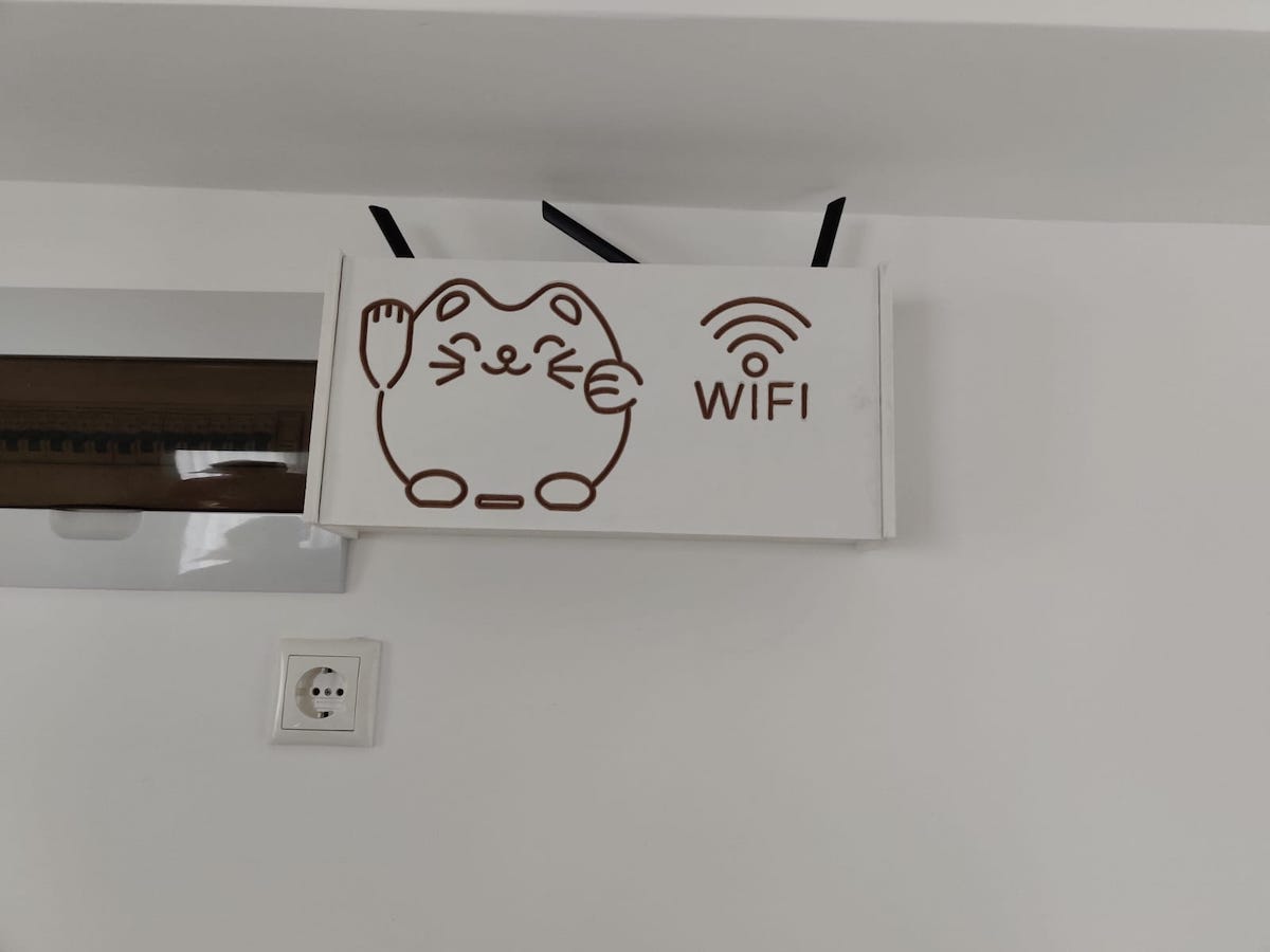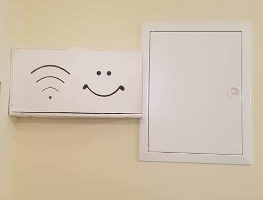 Cutia este din lemn alb și este folosită pentru mascarea firelor și a echipamentului WI-FI, cu o posibilitate de montare pe perete. De asemenea, cutiile pot fi personalizate cu diferite forme și desene. Găsiți mai multe detalii pe pagina de Facebook Wifi Box.