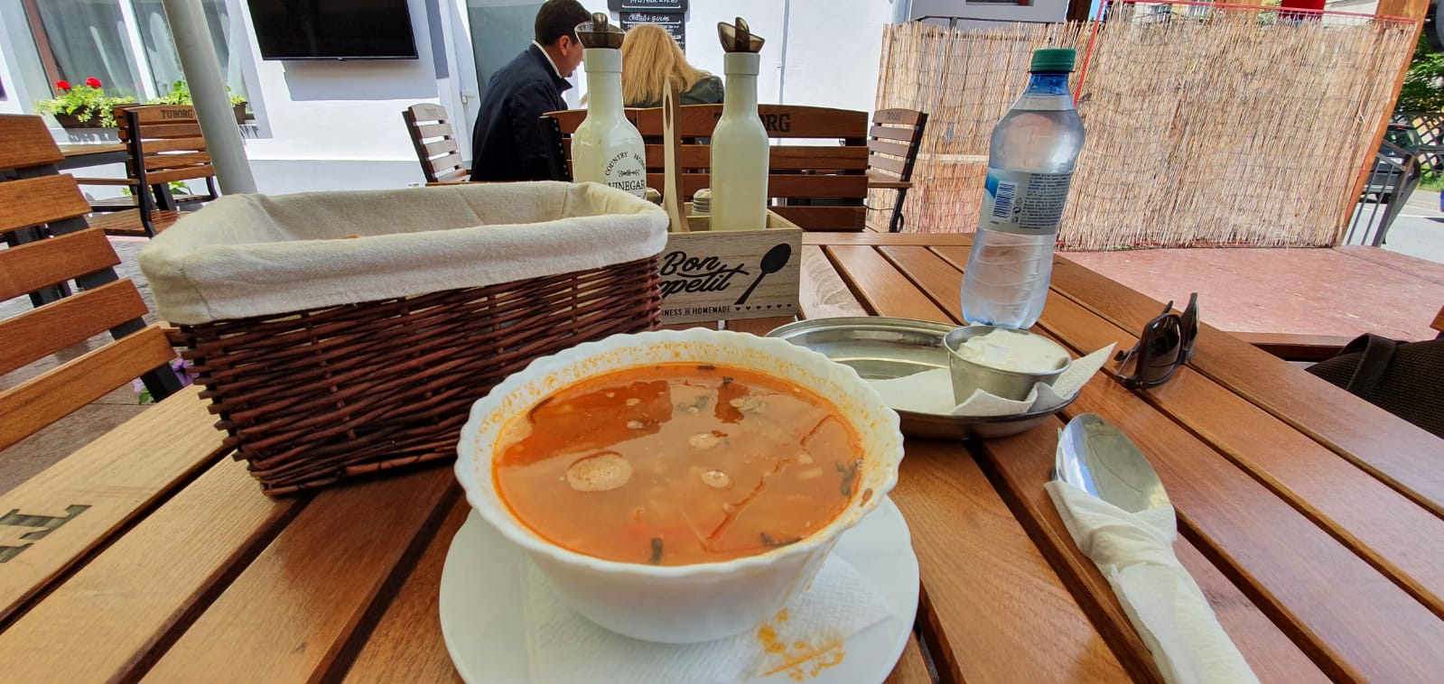 Revenind la restaurant, e genul ”Meniul zilei”. Au ciorbă și cartofi cu încă ceva pe lângă. Spre exemplu: Ciorbă de pui și cartofi ciobănești sau chiar Cordon bleu și piure de cartofi. Eu am luat precaut doi mici din cei gigantici, că doar pentru ei m-am dus acolo, și până să se pârjolească am comandat și o ciorbă de văcuță cu smântână.