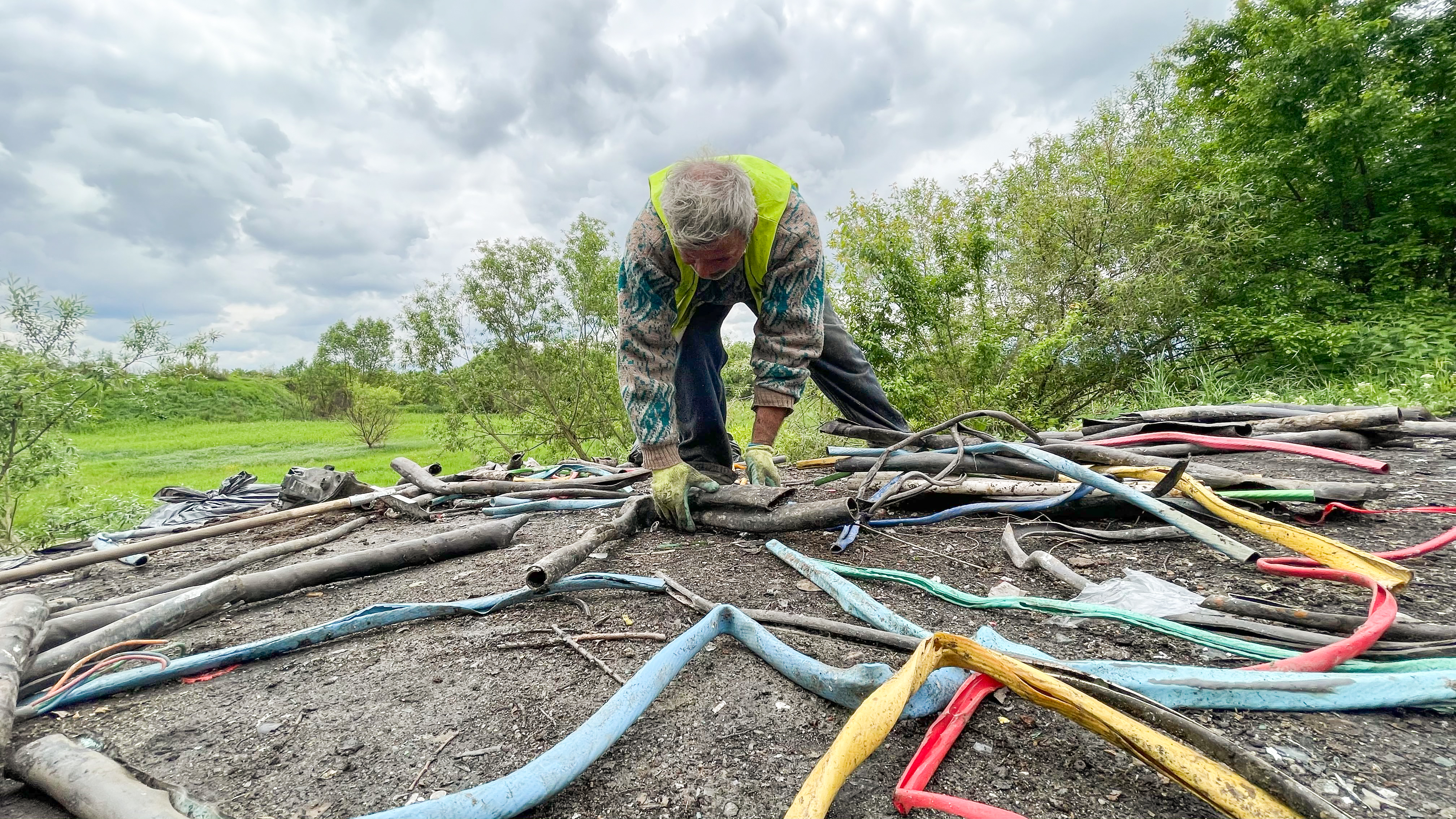 Oriunde înfigi lopata, dai de cabluri electrice și plastic topit. În spatele coșmeliei improvizate se află două baxuri enorme cu resturi din ceramică de la stâlpii de curent.