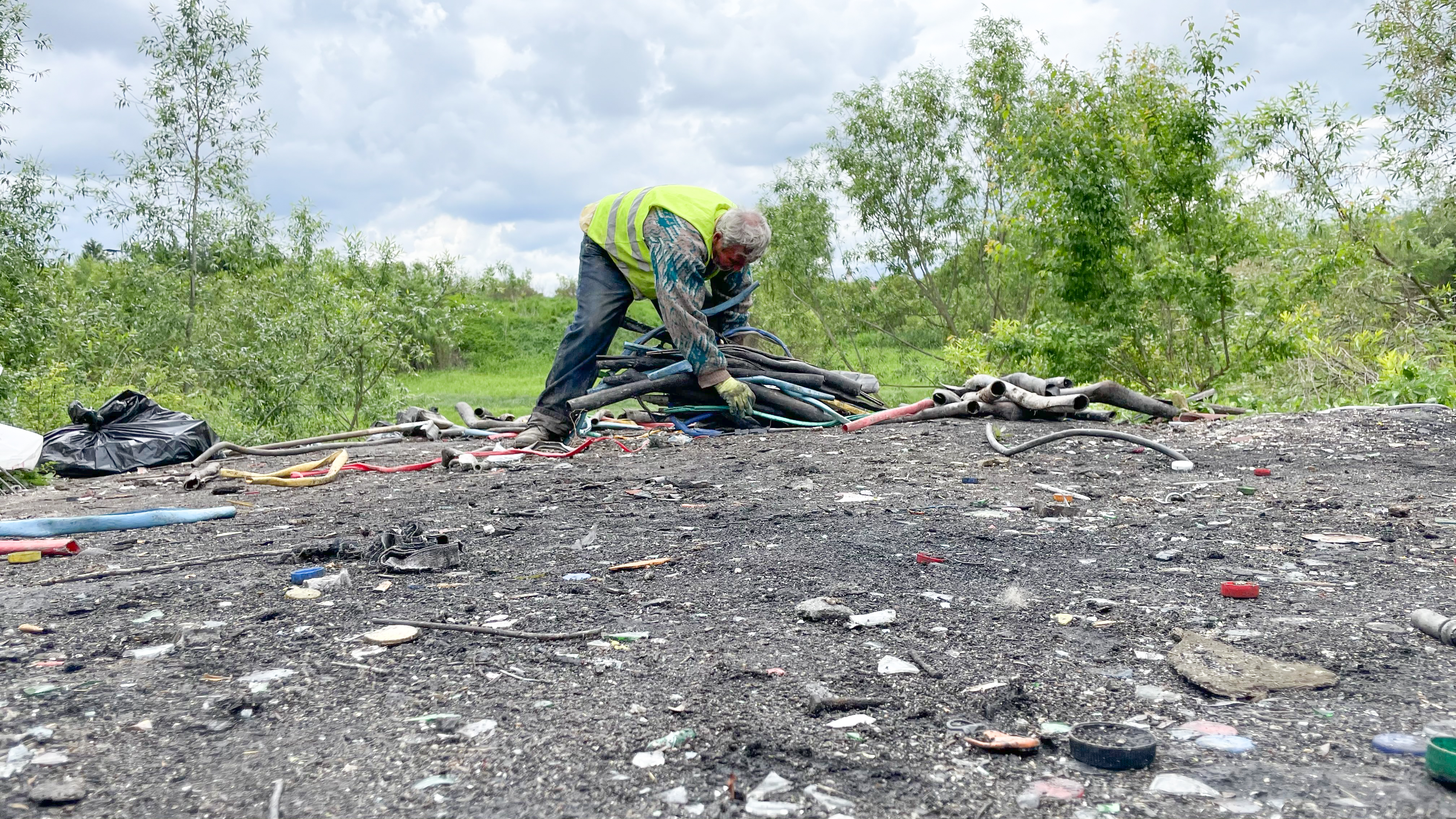 La câțiva metri de apă, se pot distinge clar urmele unor focuri uriașe. Numeroasele resturi de cabluri și bucăți de plastic topit pot duce doar la concluzia că aici ani de zile s-au topit cabluri electrice pentru a scoate la iveală metalele relativ prețioase. O zonă cu o suprafață de cel puțin 20 de metri pătrați este arsă complet, de sub cenușă și funingine ieșind din pământ resturi din plastic și sârme.