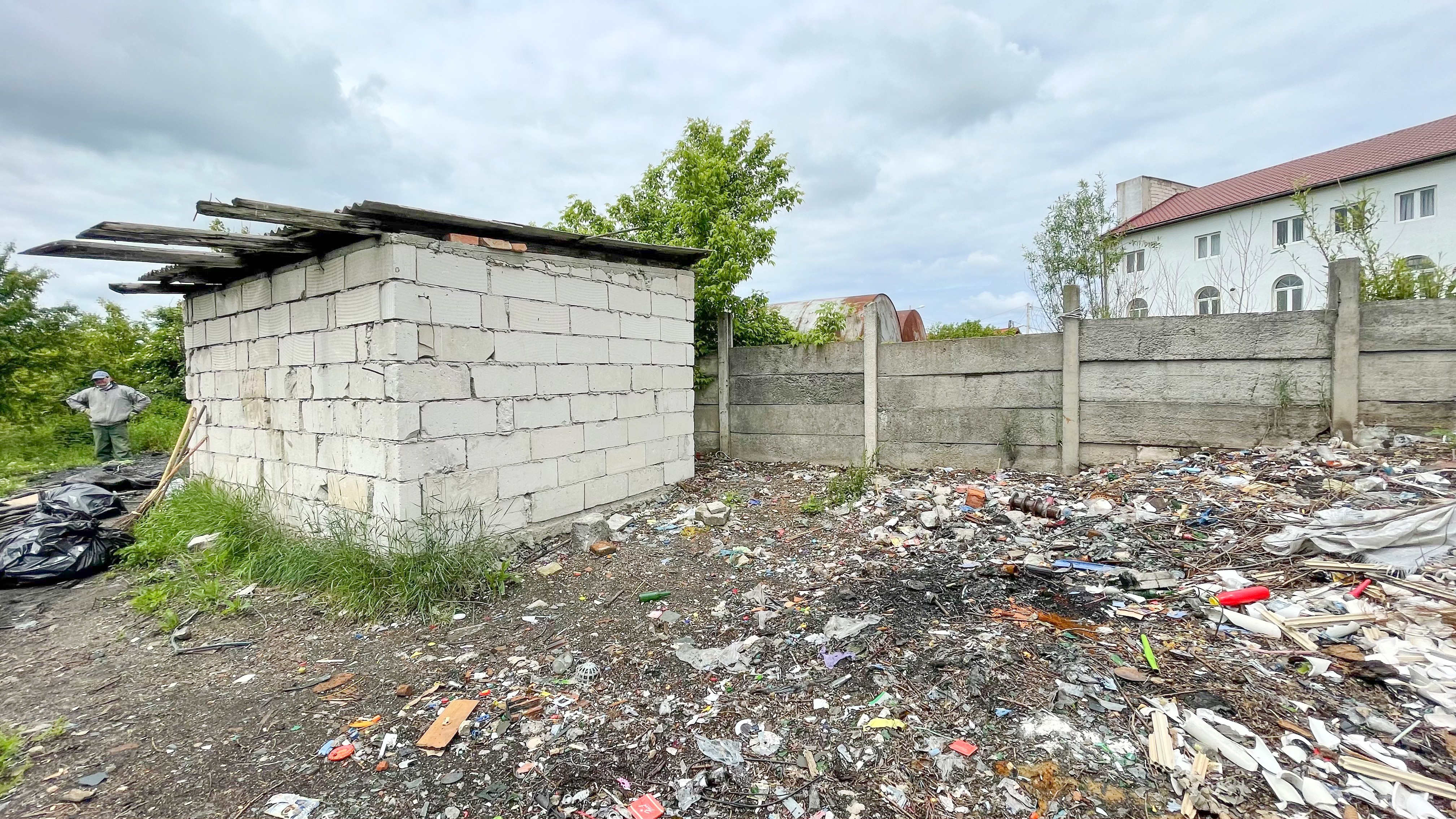 Tot în curtea bisericii se află fundația unei clădiri neterminate. De la temelie și până la nivelul solului iarăși se găsesc gunoaie cât vezi cu ochii. Într-o altă parte a curții, cea dinspre râu, se mai pot vedea componente din plastic de la diferite mașini. Ca într-un film de Kusturica, lângă biserică se află parcat un imens Cadillac aflat în descompunere.