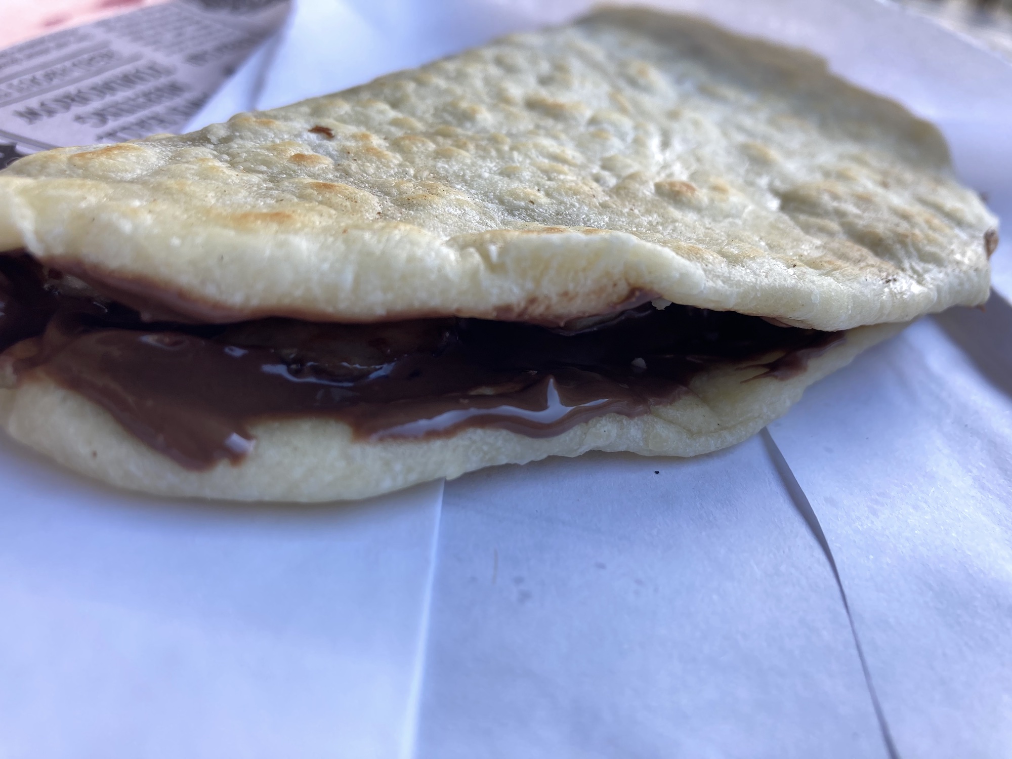 Eram deja sătul când a venit desertul, dar combinația de nutella cu banane este una pe care nu pot să o refuz, iar piadina în care erau îmbrăcate era mult mai mică. Am dovedit-o din câteva îmbucături. Bună, nu prea dulce pentru că piadina nu avea zahăr deloc, m-a satisfăcut poate chiar mai mult decât ar fi făcut-o o clătită cu aceeași umplutură. În schimb, vă anunț de pe acum că poza din meniu nu se potrivește cu ce vine la masă - dacă în poză are și zahăr pudră pe deasupra și ceva fruct, în realitate arată cam așa: