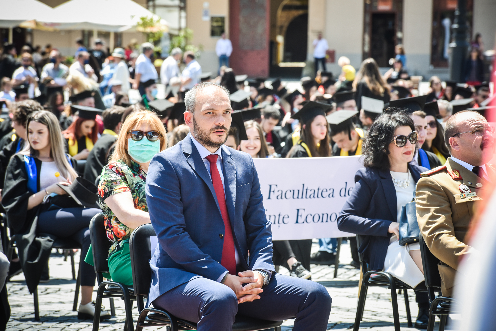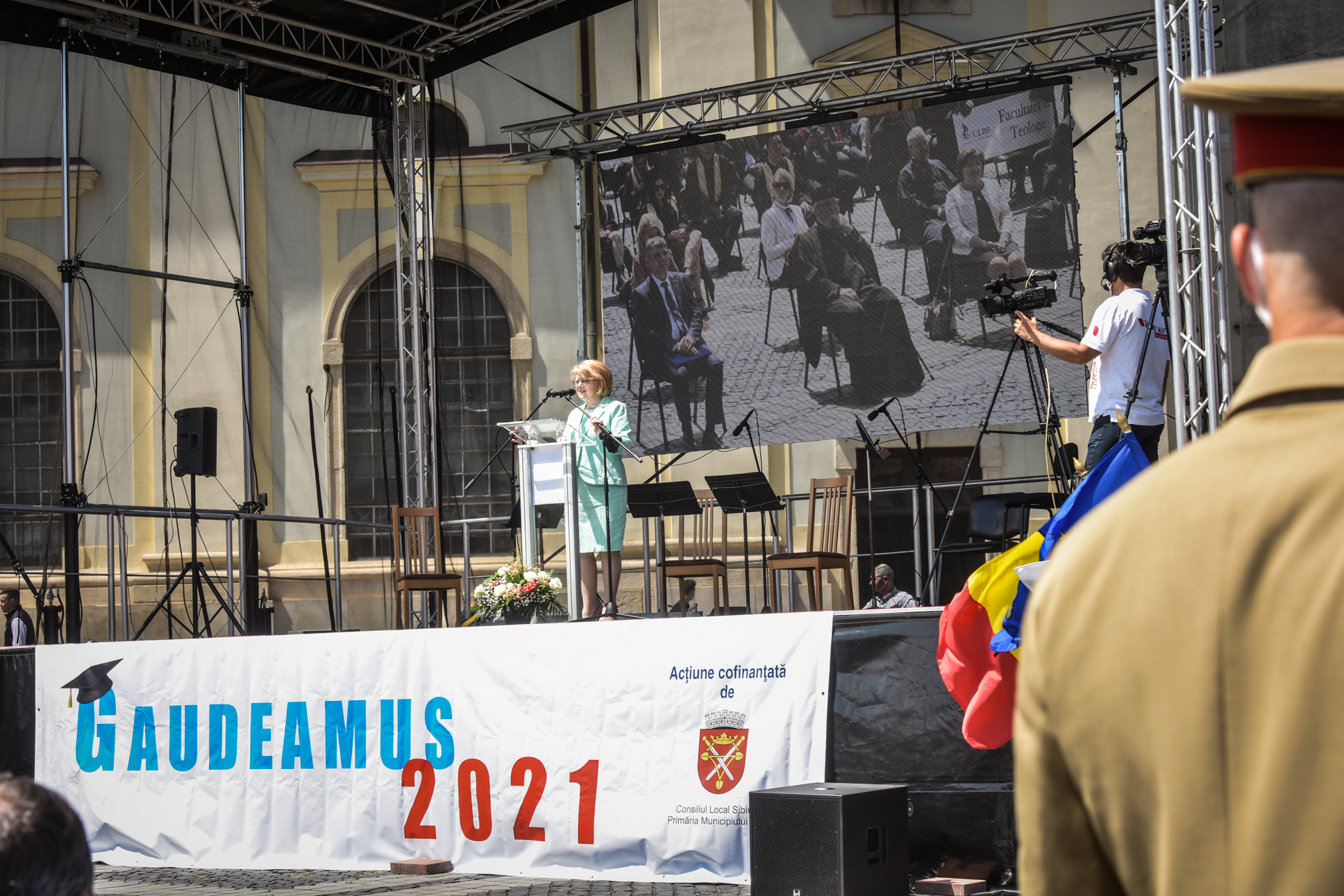„Iată-ne la sfârșitul unui an universitar cu totul aparte, în care cuvinte precum pandemie, restricții, responsabilitate, prevenție, siguranță au dominat activitatea și discursul tuturor. Ne-am întrebat și ne vom întreba mulți ani care vor fi efectele acestei pandemii asupra vieții noastre și asupra societății, deschiderea anului universitar am făcut-o în condiții generate de pandemie, într-un cadru restrâns, rezervați, temători, fără obișnuita bucurie adusă de studenții și cadrele didactice care umpleau Piața Mare. Ne întrebam cu toții când vom reveni la viața noastră obișnuită după care tânjim și pe care acum o denumim față în față. Iată-ne la finalul unui an universitar într-un număr mare, nu câți ne-am fi dorit în locul în care de ani buni deschidem un eveniment important în viața comunității sibiene, cursul festiv, ceremonia de absolvire a studiilor de către studenți. Împreună, studenți, profesori, părinți, am fost responsabili, ne-am implicat și am reușit să ducem la bun sfârșit un an universitar greu. Este o zi a bucuriei”.