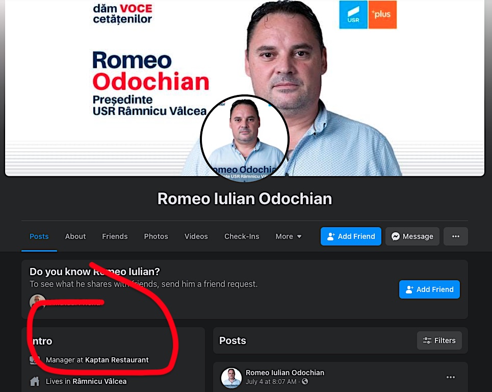 Deși pe pagina sa de Facebook, președintele USR PLUS se prezintă ca manager al Kaptan Restaurant, ulterior el anunță că de fapt este doar angajat part-time care se ocupă, printre altele, de conceperea meniului