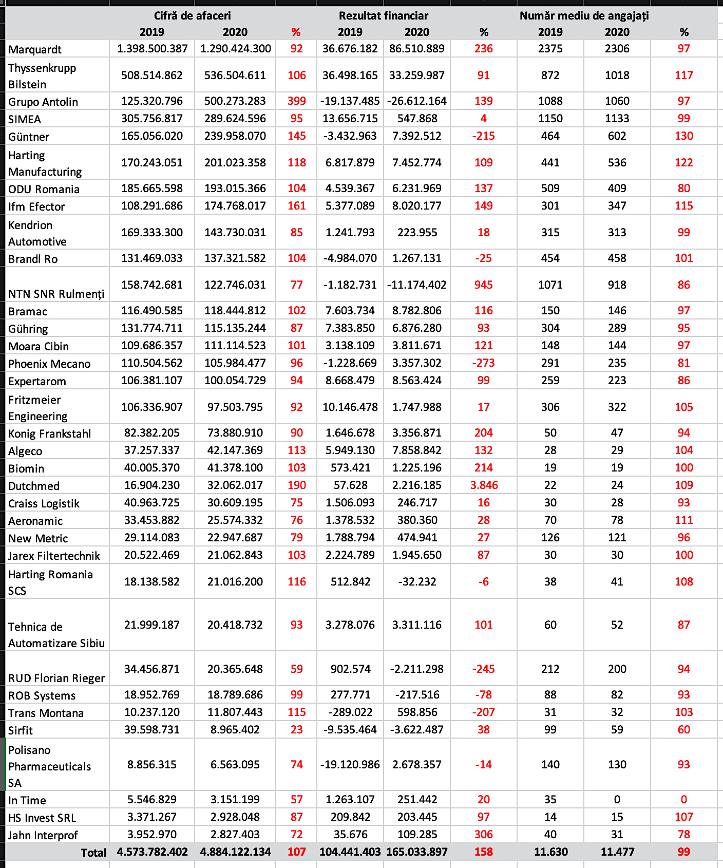 În rândul companiilor cu peste 100 de angajați, cele mai mari reduceri de personal s-au înregistrat la ODU România (de la 509 la 409 angajați), Phoenix Mecano (de la 291 la 235 de angajați) și, respectiv, la NTN SNR Rulmenți (de la un număr mediu de 1.071 de angajați la 918). Procentual, cele mai multe scăderi de personal sunt cuprinse în intervalul 3-14%.