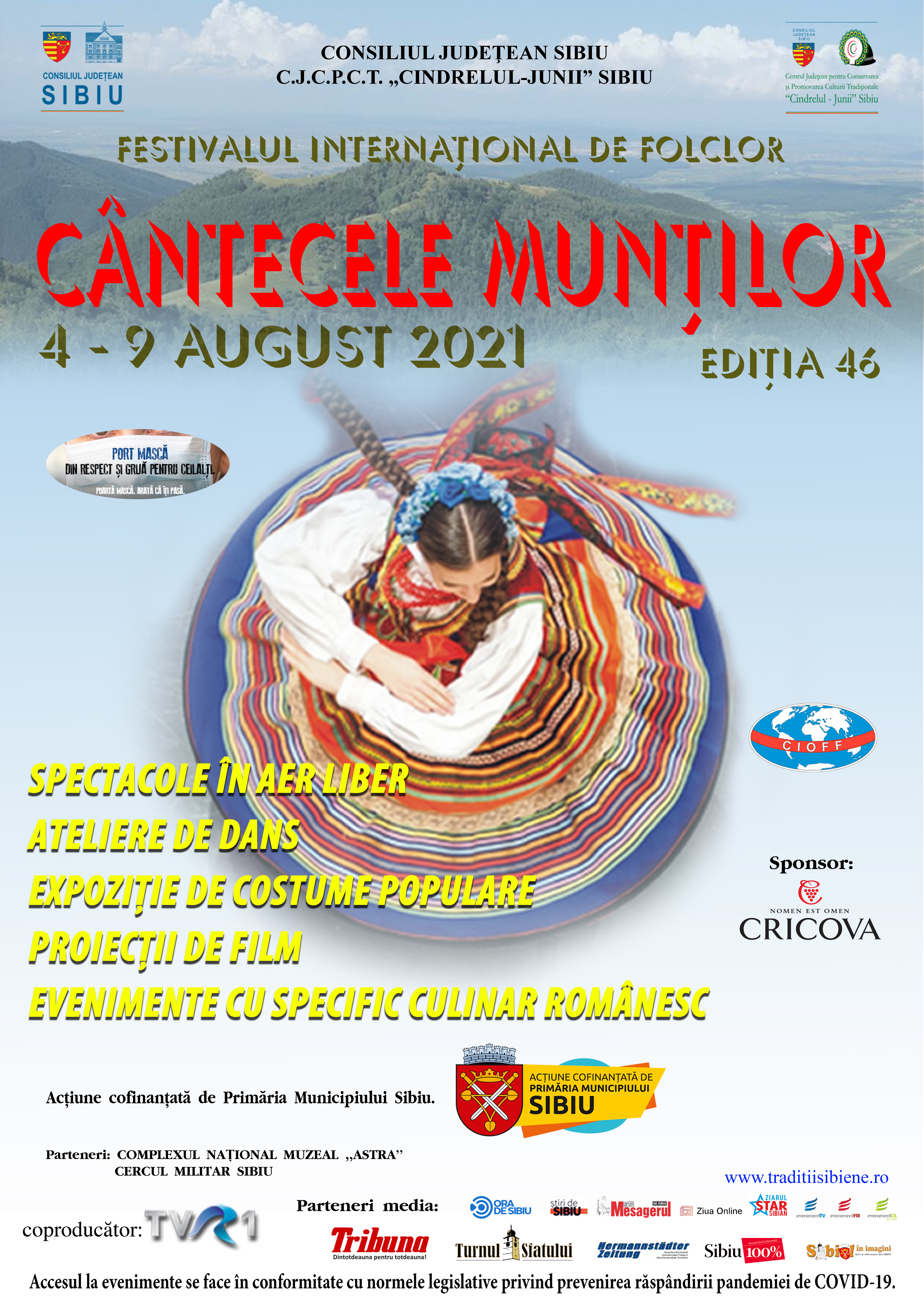 Arta culinară este celebrată la cea de-a 46-a ediție a Festivalului Internațional de Folclor „Cântecele Munților”, prin trei evenimente gastronomice. Festivalul se desfășoară la Sibiu, în perioada 4-9 august 2021, fiind organizat de Consiliul Județean Sibiu și Centrul Județean pentru Conservarea și Promovarea Culturii Tradiționale „Cindrelul - Junii” Sibiu și cofinanțat de Primăria Municipiului Sibiu.
