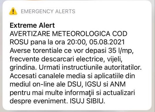 Codul a intrat în vigoare la 18:40 și este valabil până la ora 20. Potrivit avertizării, sunt așteptate vijelii puternice cu rafale de peste 90 km/h, grindină, descărcări electrice, averse torențiale ce pot depăși 35l/mp în județul Sibiu, respectiv în localitățile Sibiu, Cisnădie, Tălmaciu, Săliște, Rășinari, Șelimbăr, Ocna Sibiului, Miercurea Sibiului, Gura Râului, Loamnes, Orlat, Cristian, Șura Mare, Sadu, Păuca, Șura Mică, Boița, Apoldu de Jos, Ludoș precum și în zona de munte.