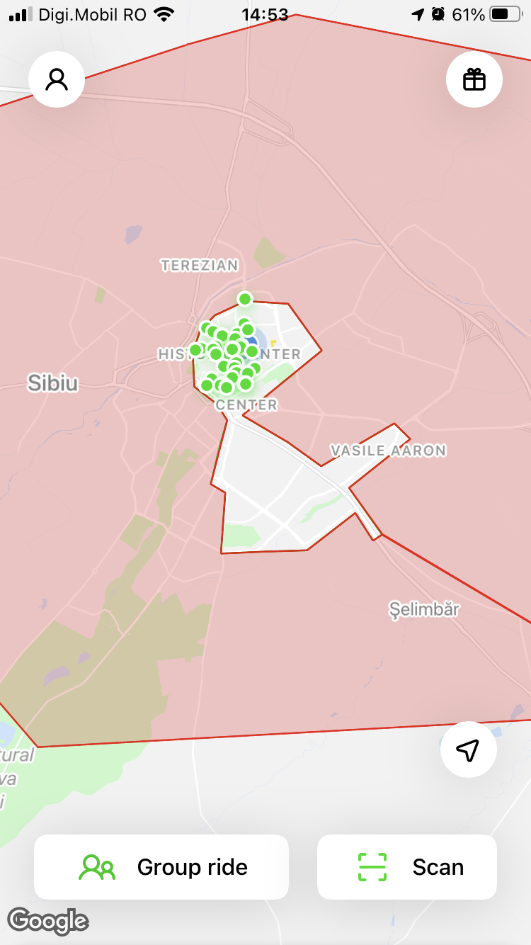 Ne-am trezit într-o dimineață cu tot orașul plin de trotinete, iar tinerii nici n-au stat pe gânduri până să le închirieze. Așa că duminică, după un prânz copios, mă îndreptam spre casă și, având deja instalată aplicația, am decis să iau o trotinetă. M-am descurcat ușor cu primii pași - închirierea se face prin scanarea unui cod QR de pe ghidon, iar trotineta pornește automat. De aici au început peripețiile. Pornirea de pe loc m-a luat prin surprindere, pentru că nu mă mai urcasem de mult timp pe o trotinetă electrică și atunci când am apăsat pe accelerație, aproape a plecat fără mine. Odată ce m-am obișnuit cu ea, drumul până acasă a fost lejer. Vorba vine „până acasă”, pentru că harta din aplicație m-a atenționat că nu am voie să parchez oriunde în Sibiu. Așa se face că am făcut cale întoarsă de la Profi-ul de pe Calea Cisnădiei, acolo unde voiam să parchez inițial, până la intersecția cu Rahovei, unde harta îmi arăta că este zona verde pentru a lăsa trotineta.