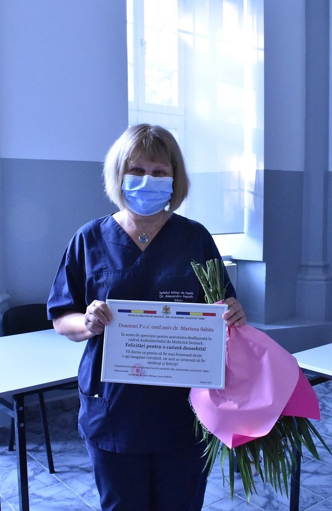 „După 46 de ani de activitate la Spitalul Militar de Urgență ”Dr. Alexandru Augustin” din Sibiu, doamna conf. univ. dr. Mariana Sabău a primit, ieri, 12 august, cu ocazia pensionării, în semn de apreciere pentru activitatea desfășurată în cadrul Ambulatoriului de Medicină Dentară al instituției, o diplomă din partea comandantului spitalului.