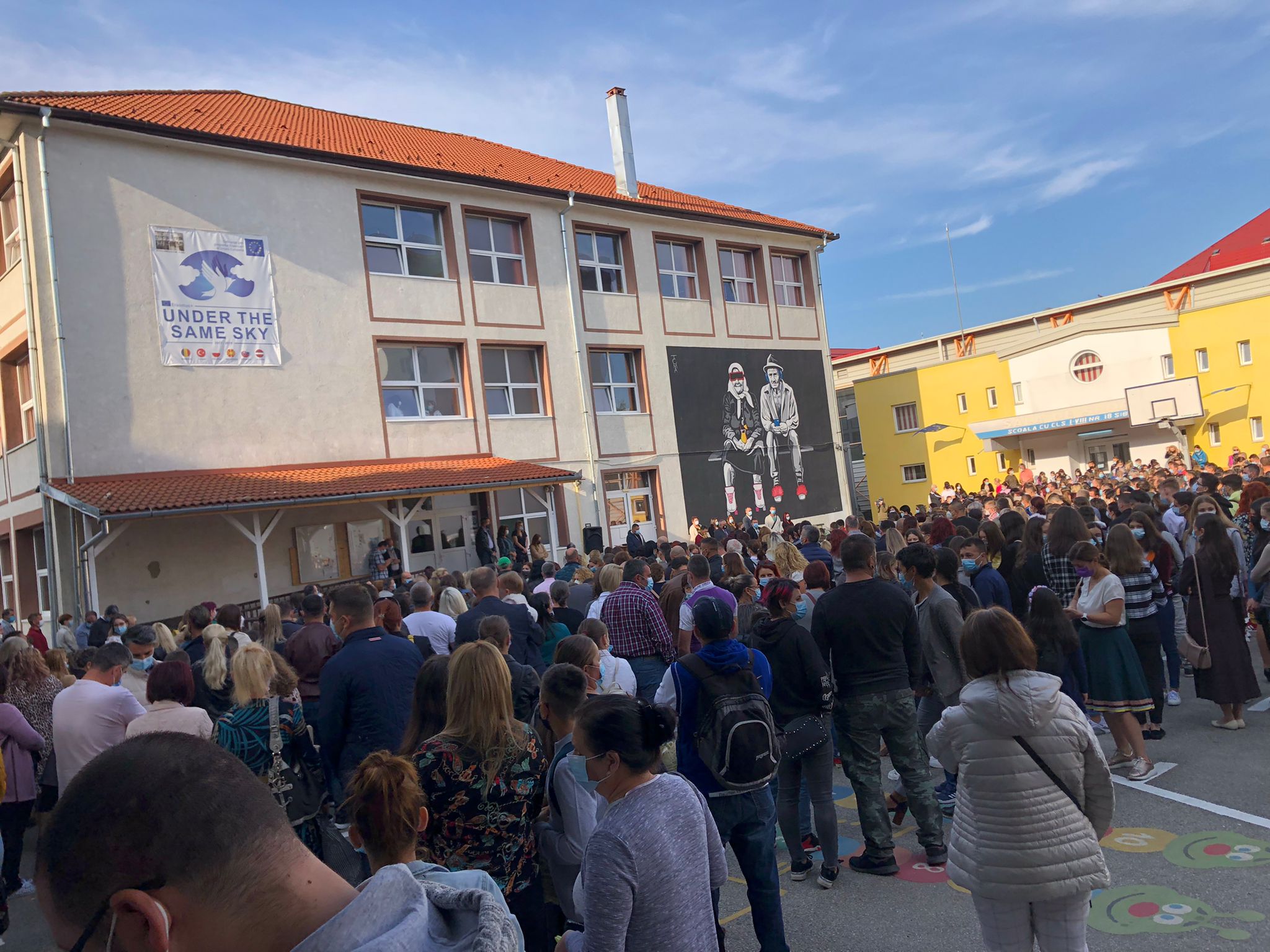 Este aproape ora 9.00 dimineața și în jurul colegiului se adună din ce în ce mai multă lume. Polițiștii au promis încă de duminică după amiază, printr-un comunicat, că vor fi alături de elevi și se vor asigura că totul decurge fără incidente. Ei bine, sunt acolo. Un polițist și o polițistă se asigură că traficul este fluid, că șoferii nu opresc unde nu au voie și că elevii sunt în siguranță. Pe trotuar, printre oameni își face loc Talida, un ghemotoc de fetiță, toată numai o bucurie. O ține de mână pe mama ei care i-a aranjat, cu câteva secunde înainte masca pe fața mică. Ochii, de un căprui închis, sunt singurii care îi mai pot transmite emoțiile și o fac minunat. Râd și sclipesc la fiecare rotire dată de jur împrejur. Deodată, privirea i se oprește pe o altă fetiță de vârsta ei. Talida o ia în brațe cu nemărginit entuziasm. Cu siguranță este una dintre prietenele ei de la școală. Dulce revedere.