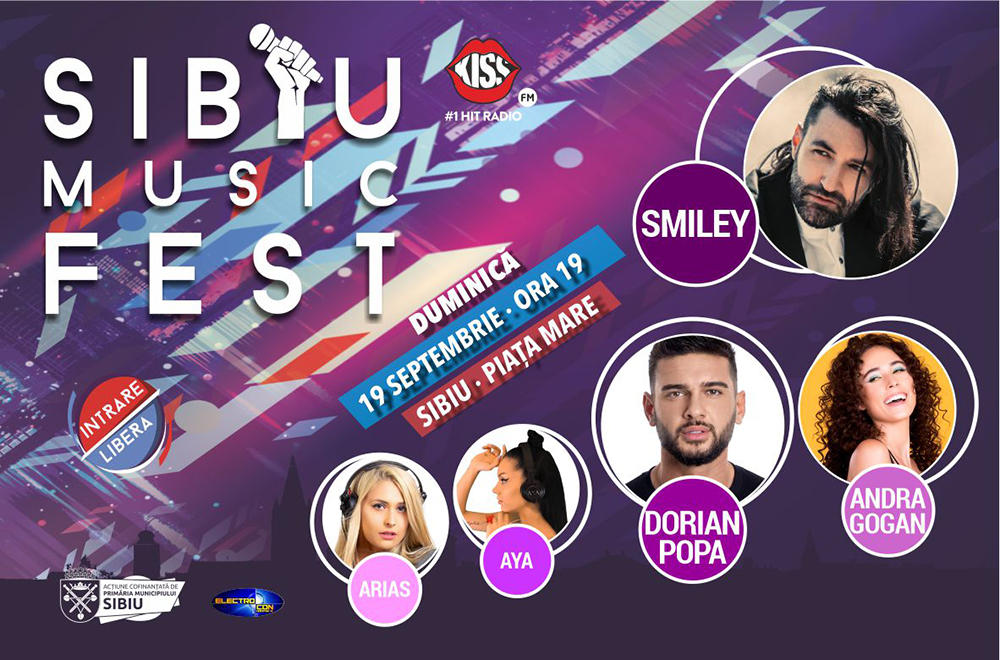 Duminică seara, de la ora 19, în Piața mare din Sibiu are loc Sibiu Music Fest. Invitații speciali din acest an sunt Smiley, Andra Gogan, Dorian Popa, Aya și Arias. Informații despre eveniment găsiți aici.